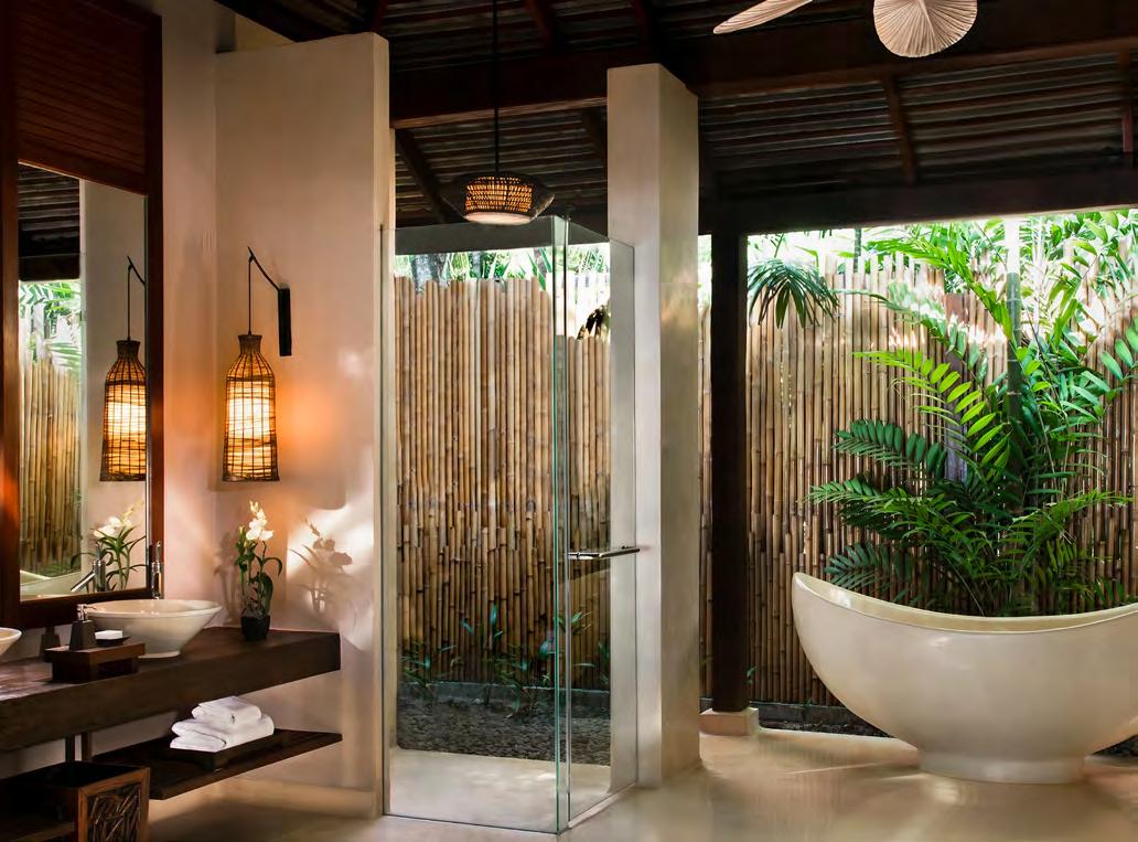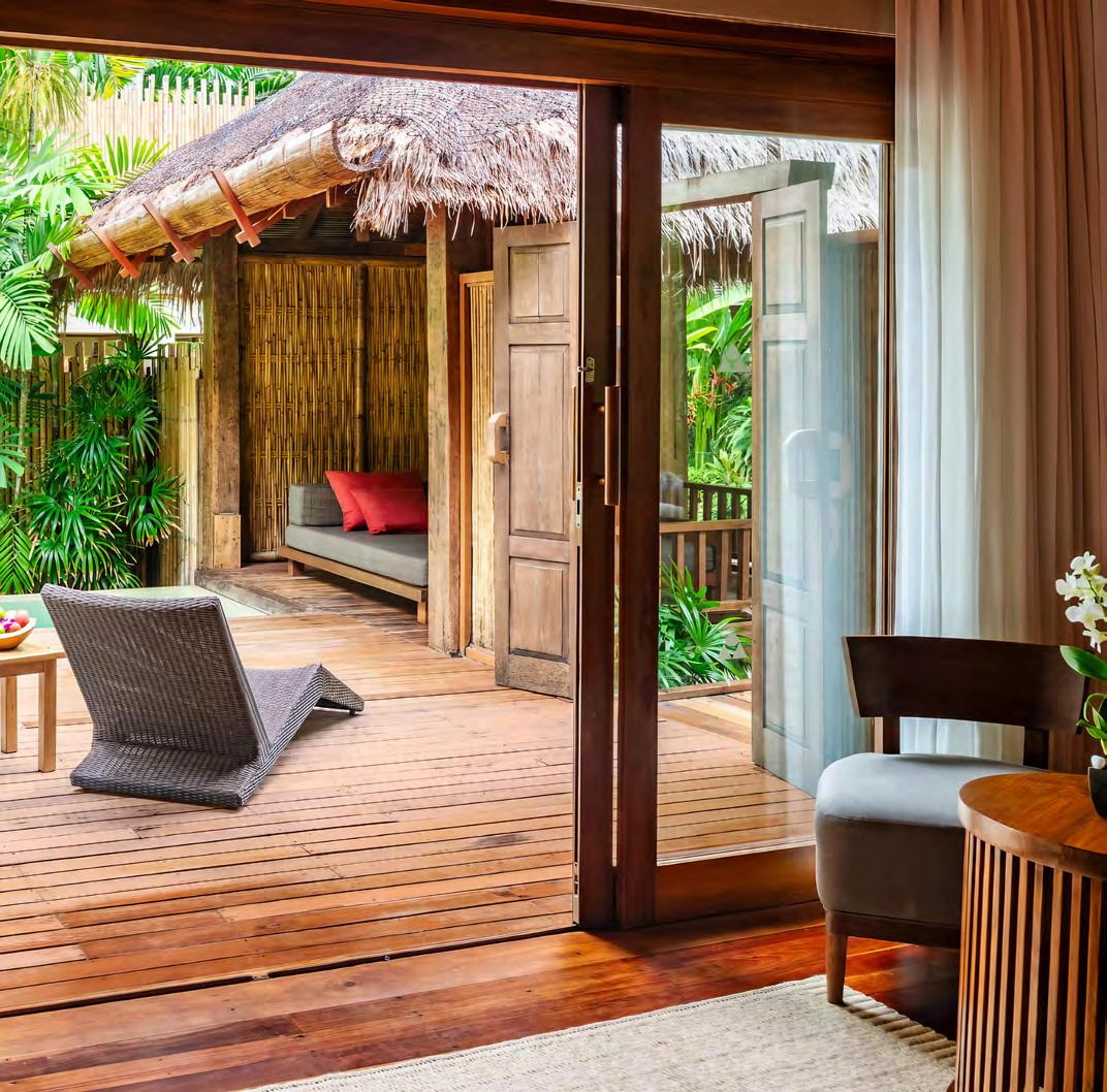 The villas, which form the heart of the experience, are conceived not merely as accommodations but as personal retreats. Each one celebrates tropical indoor–outdoor living, with high ceilings, warm teak, soft fabrics, and design notes that echo southern Thai craftsmanship. Most feature private plunge pools framed by lush gardens or shaded terraces, creating spaces where guests can sunbathe in seclusion, cool off under the palms, or enjoy a quiet breakfast accompanied only by birdsong. Bathrooms are generously oversized, with deep soaking tubs and rain showers that open to the air. Some villas sit directly on the beach, allowing guests to step from their terrace onto sand still cool from the morning’s tide. Others are nestled deeper within the gardens, where bamboo and palm fronds create a cocoon of privacy. Although each category has its own character, what binds them is a consistent sense of serenity — a feeling that you are living inside a sanctuary shaped entirely for your own rhythm.
