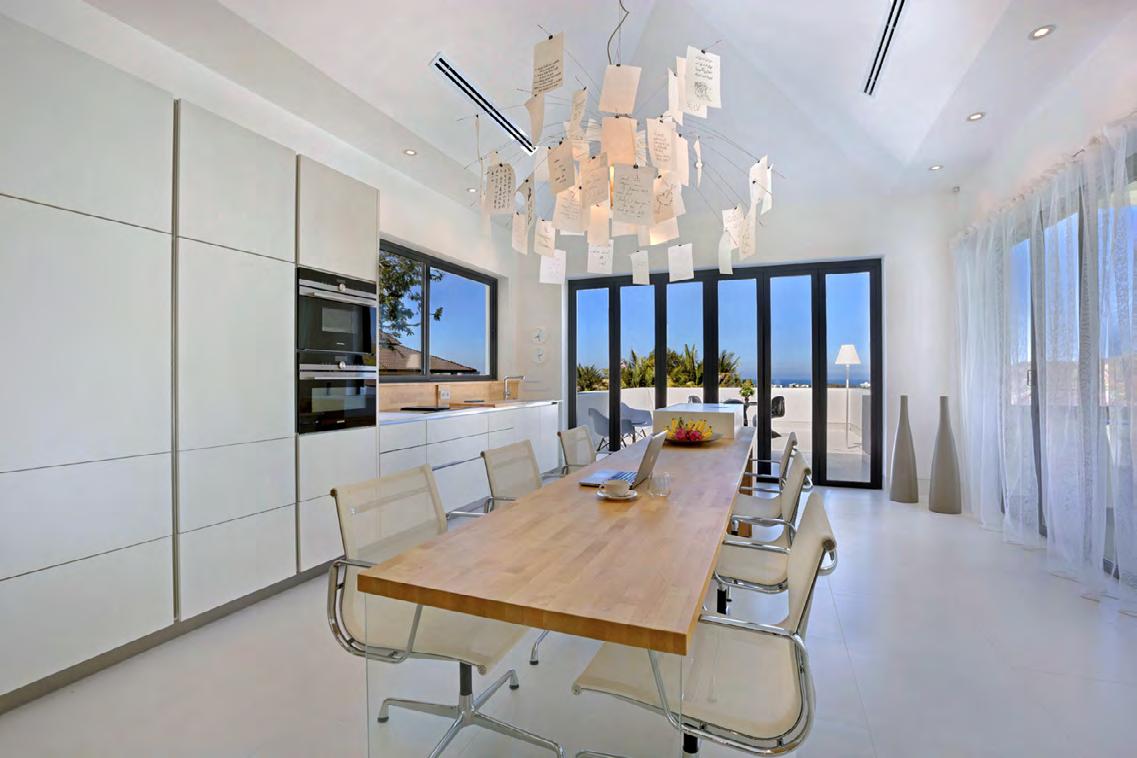 At the heart of the home is a superbly equipped kitchen that will delight serious cooks and private chefs alike. A broad marble island anchors the space, integrating hob and preparation areas while creating a natural gathering point for casual breakfasts or evening drinks. Clean-lined cabinetry keeps the look contemporary and uncluttered, while the adjoining formal dining room shifts the mood to pure occasion. Here, a long glass-topped table, high-backed chairs and sculptural accents sit beneath warm lighting, creating a setting equally suited to intimate dinners and lavish celebrations.