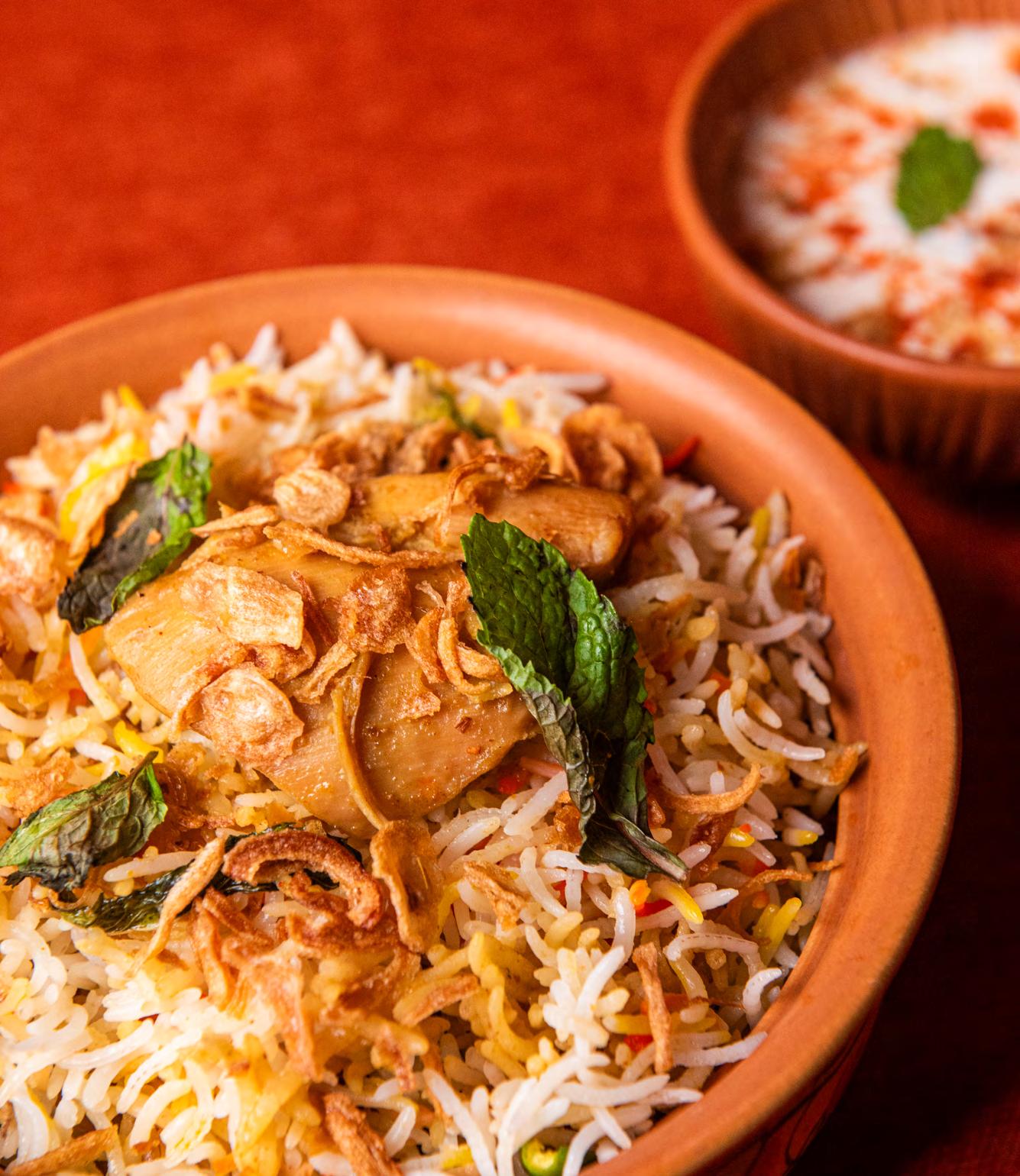 tomato-cashew sauce. For something heartier, Shahi Lamb Leg Musallam comes glazed in almond-cashew paste, while Mutton Nehari is slow-cooked overnight until it practically slips off the bone.