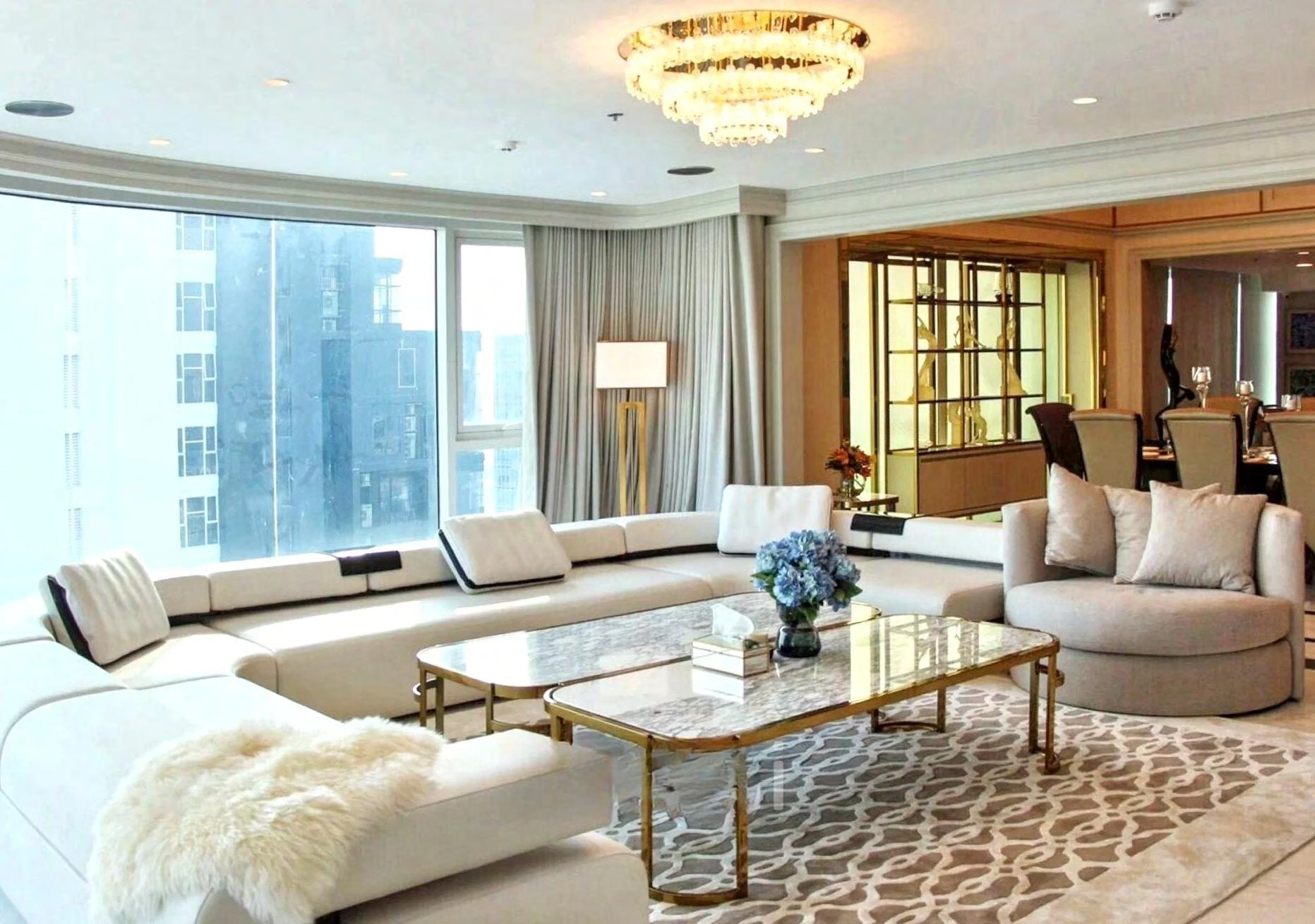 Step inside and the sense of volume is immediate. Floor-to-ceiling windows wrap the main living salons, framing an ever-changing panorama of towers, temples, and big-sky sunsets. A soft, neutral palette of creams and dove greys sets a serene tone, while glossy marble floors, plush rugs and a statement chandelier underline the home’s sophisticated, city-club aesthetic. The vast, curved sofa and twin marble coffee tables are designed for entertaining on a grand scale, yet the space still feels warm and inviting – a place to unwind with family as much as to host a champagne-fuelled soirée.
