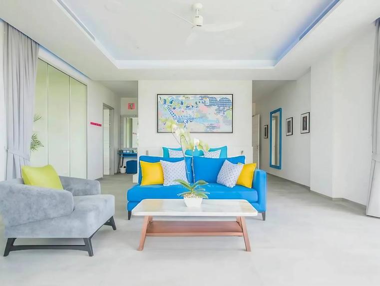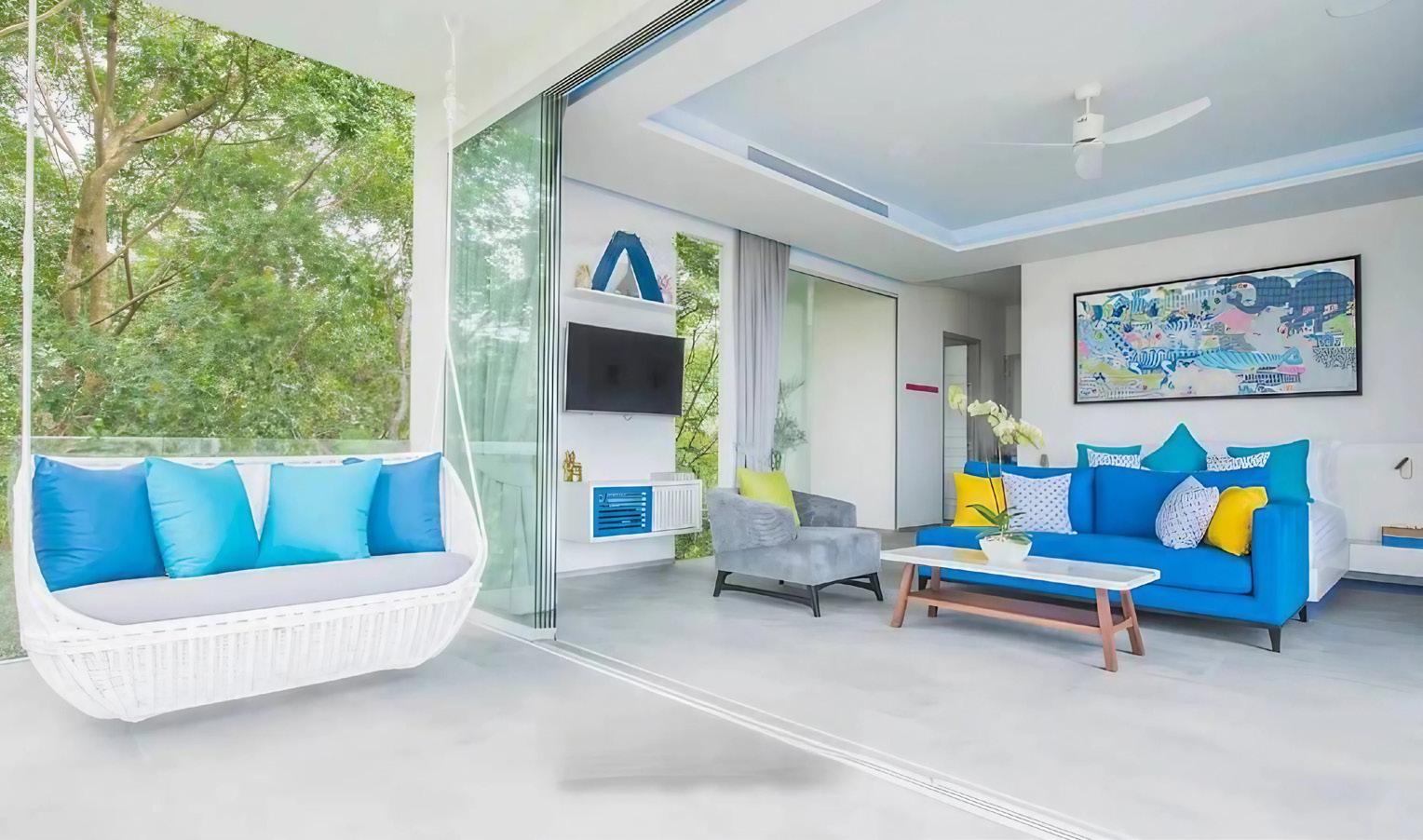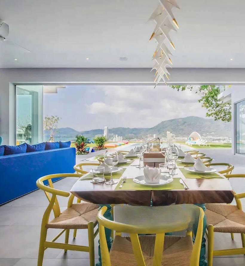 Inside, the mood is clean and sunlit, with pale floors and recessed ceilings that frame the daylight like a gallery frames art. The palette stays intentionally calm— white, stone, soft grey—then punctuates itself with joyful, resort-bright colour: a cobalt sofa with citrus cushions, playful contemporary artwork, and thoughtful lighting details that shift the atmosphere from morning clarity to evening allure. The design language is modern, but the sensibility is unmistakably Phuket: indoor–outdoor living as a daily rhythm, not a weekend novelty. Sliding walls dissolve, and suddenly the boundary between living room and terrace is simply… gone.