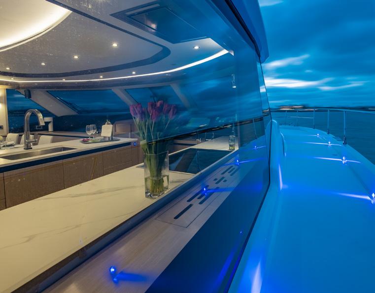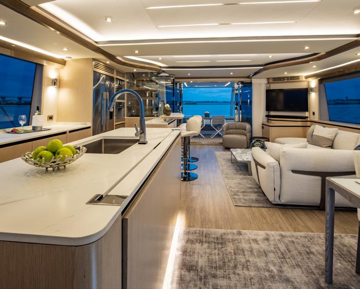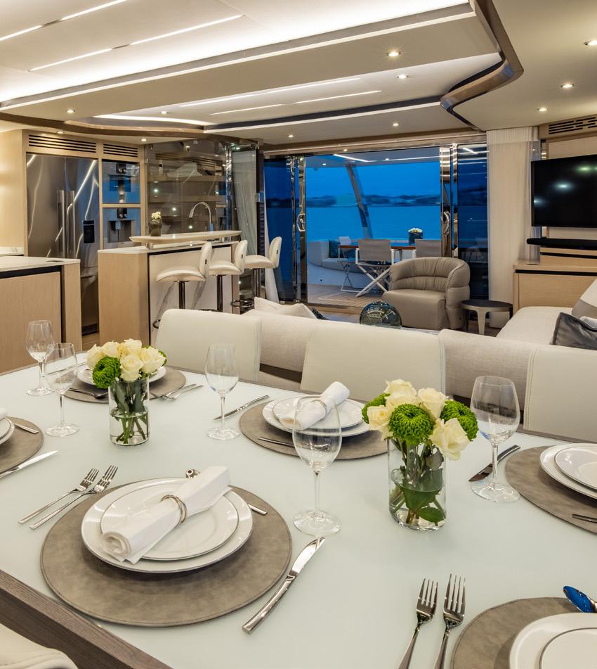 Outside, the yacht’s decks play their own role in the narrative. Expansive outdoor spaces are designed to provide panoramic views that stretch to the horizon, reframing ordinary moments as memories. A morning coffee becomes a ritual performed against a cinematic shoreline; an afternoon pause becomes a frontrow seat to shifting light; an evening gathering becomes an event in itself, staged in open air. Aquila’s language is precise here: every texture, every line, every feature crafted with intention—nothing wasted, nothing superfluous. It’s a philosophy that resonates strongly with today’s best luxury design, where the highest sophistication is often found in restraint, proportion, and purpose.