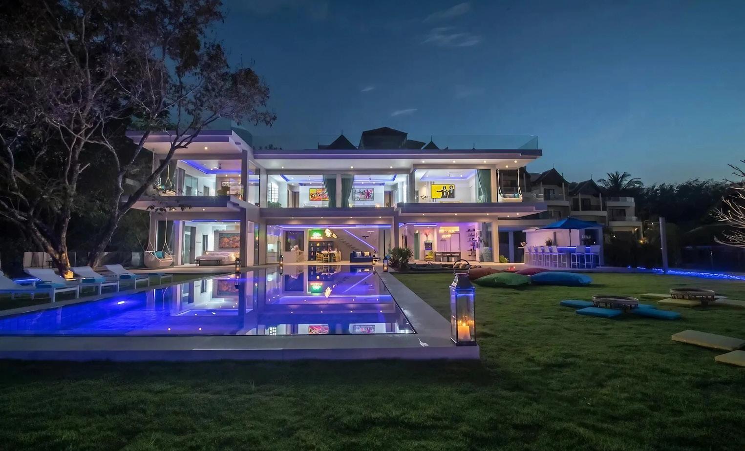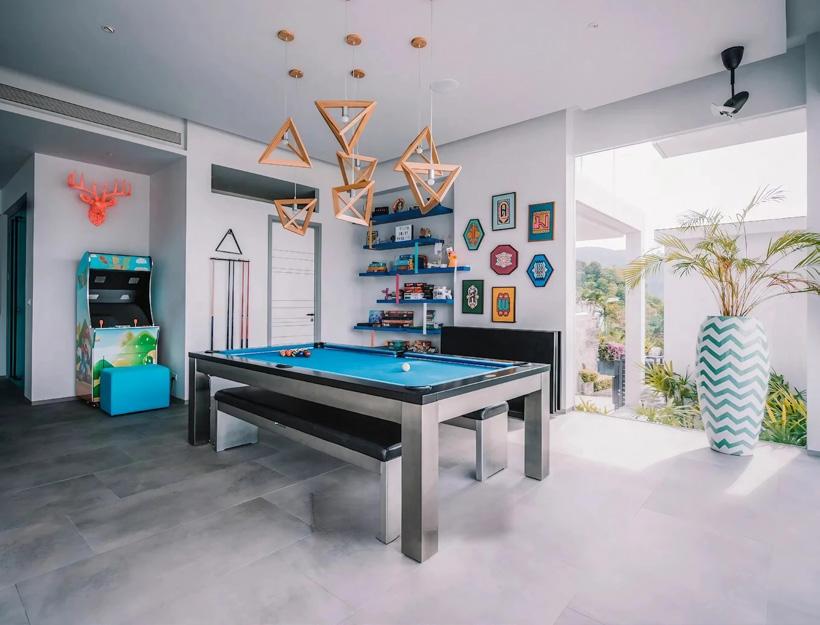 The heart of the home is its open-plan social spine—lounge, dining, and a Western-style kitchen arranged to keep the horizon always in sight. By day, a long dining table sits under sculptural lighting, set against a wide opening to the terrace, as if lunch naturally wants to drift toward the pool. By night, the villa transforms: soft violet and electric-blue cove lighting turns the interior into something more metropolitan, a nod to Patong’s after-dark energy, only curated and contained. A billiards zone and home-theatre comforts bring a sense of play, while practical luxuries—garage, maid’s room, laundry, and security features— keep the experience effortless rather than performative.
