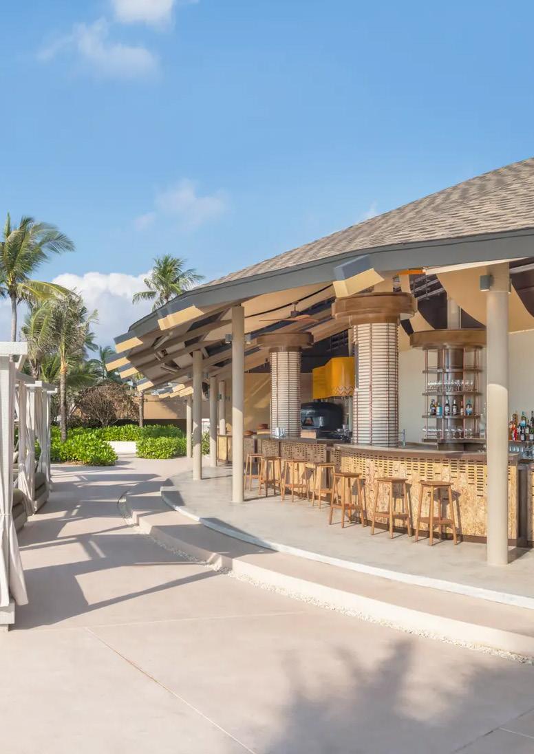 Food is pure indulgence: champagne brunches with Beluga caviar blinis, lobster thermidor, and Samui mango ceviche, plus health-focused acai bowls. Pools pulse with central DJ stages and swim-up tiki bars, blending relaxation with revelry.