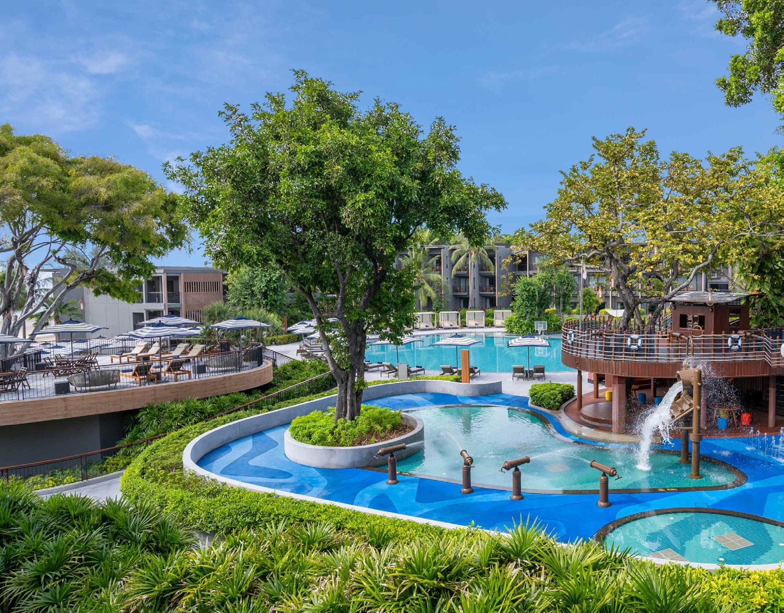 Food elevates beach fare to art: think towering seafood platters with Phuket lobster, Wagyu beef sliders infused with Thai basil, and vegan poke bowls using local superfoods—all sourced daily for freshness. Pools dominate with a massive main lagoon plus kids' splash zones, ensuring family fun transitions to adult cabanas by dusk.