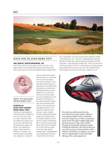 he’s undertaken, but the course he was asked to create in Hertfordshire, UK – around a neglected 18th-century parkland littered with mature trees and beside the M25 motorway – was arguably tougher still. That it’s now one of the best courses in the UK is remarkable, and playing here gives golfers the chance to play 18 richly diverse holes amid a glorious slice of countryside. thegrove.co.uk