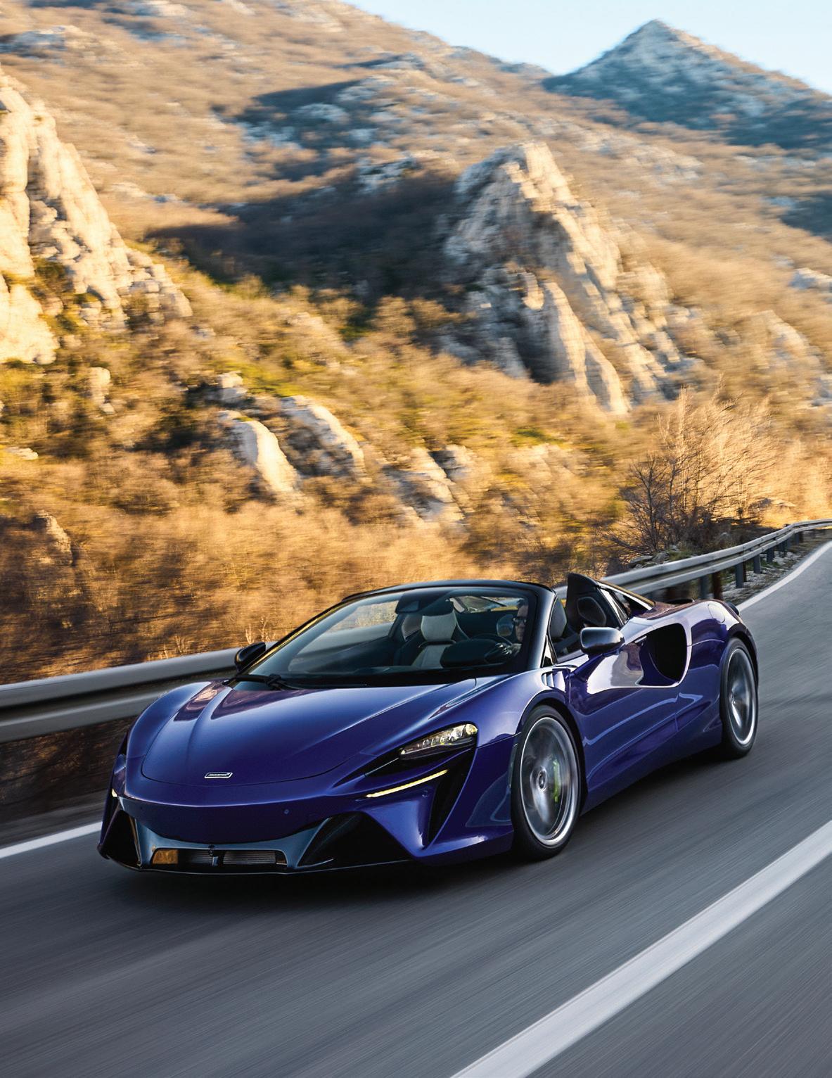 safe in the knowledge that it’s ready and waiting for you to fire up the cylinders when you hit the (occasionally) open road. Care in the community aside, the main job of electric motors in this car is to complement the petrol engine and provide rapid acceleration with incredible throttle response. When you want to turn on the taps and let the Artura Spider sing, McLaren has upped the drama with a greater crescendo of sound provided by a revised exhaust design. There’s also an optional sports exhaust for those who want the maximum difference between electric and combustion sounds. The result: a supercar that is by no means the fastest in the market (although 609bhp, 3 seconds to 100km/h and a top speed of 330km/h is ample in anyone’s books), but probably one of the quickest from A to B. The power combination undoubtedly contributes to this, but it’s the sum of the Artura Spider’s parts that make this model such an absorbing proposition. McLaren’s sublime hydraulic steering is matched with its trademark low scuttle, offering fantastic sight lines out of the