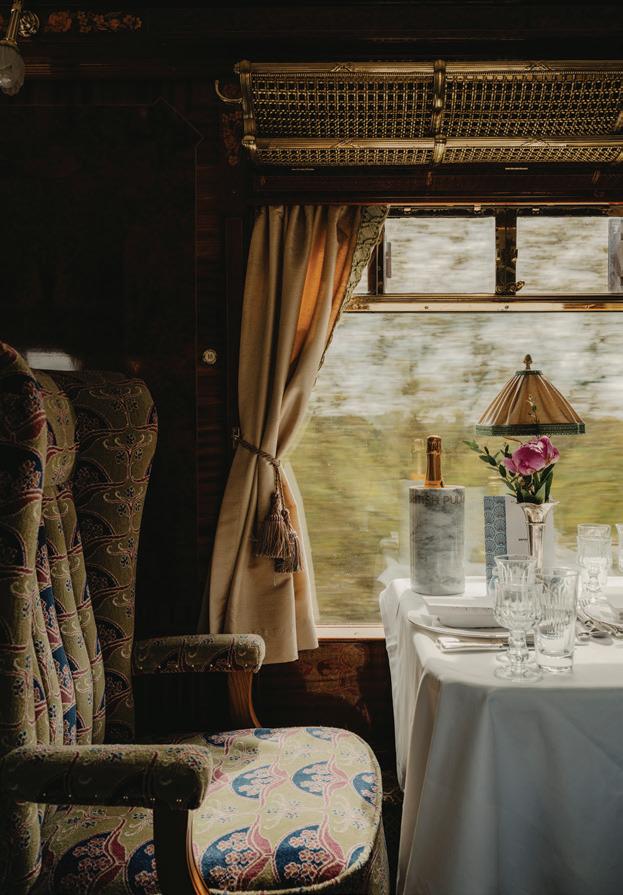 In fact, every inch of this legendary locomotive exudes the glamour of a bygone era, the golden age of travel – the level of artistry, the depth of detail both extraordinary. This is nowhere more apparent than in the ornate woodwork. Unique in each individually designed carriage, the elaborate marquetry is the work of A Dunn & Son, an English studio that dates to 1895, which in between times also designed panelling for ocean liners including the Titanic. The studio is now run by Albert’s greatgranddaughter Cheryl and still adheres to traditional methods dating back to the 1700s. Once a year, this intricate