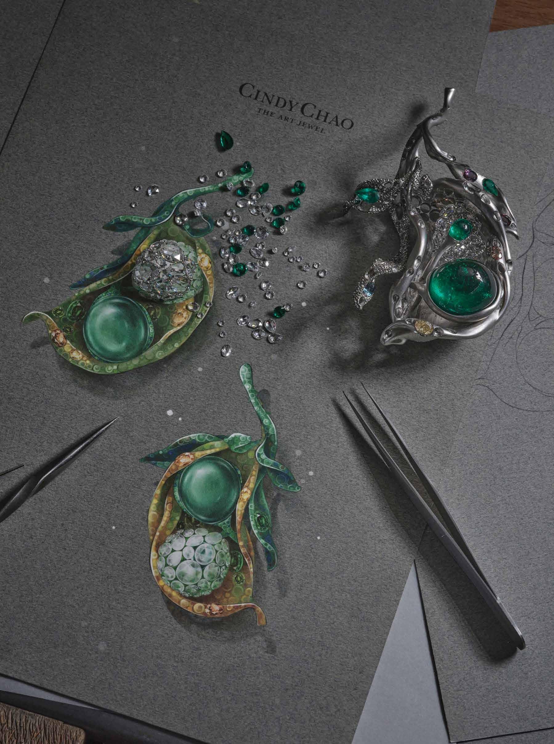 Three years ago, Chao was sitting on a pair of astonishingly large cabochon emeralds of 81 carats each (imagine a gobstopper sliced in half), but hadn’t yet conceived what to do with them when she happened upon cardamom while looking through a book of botanical drawings.