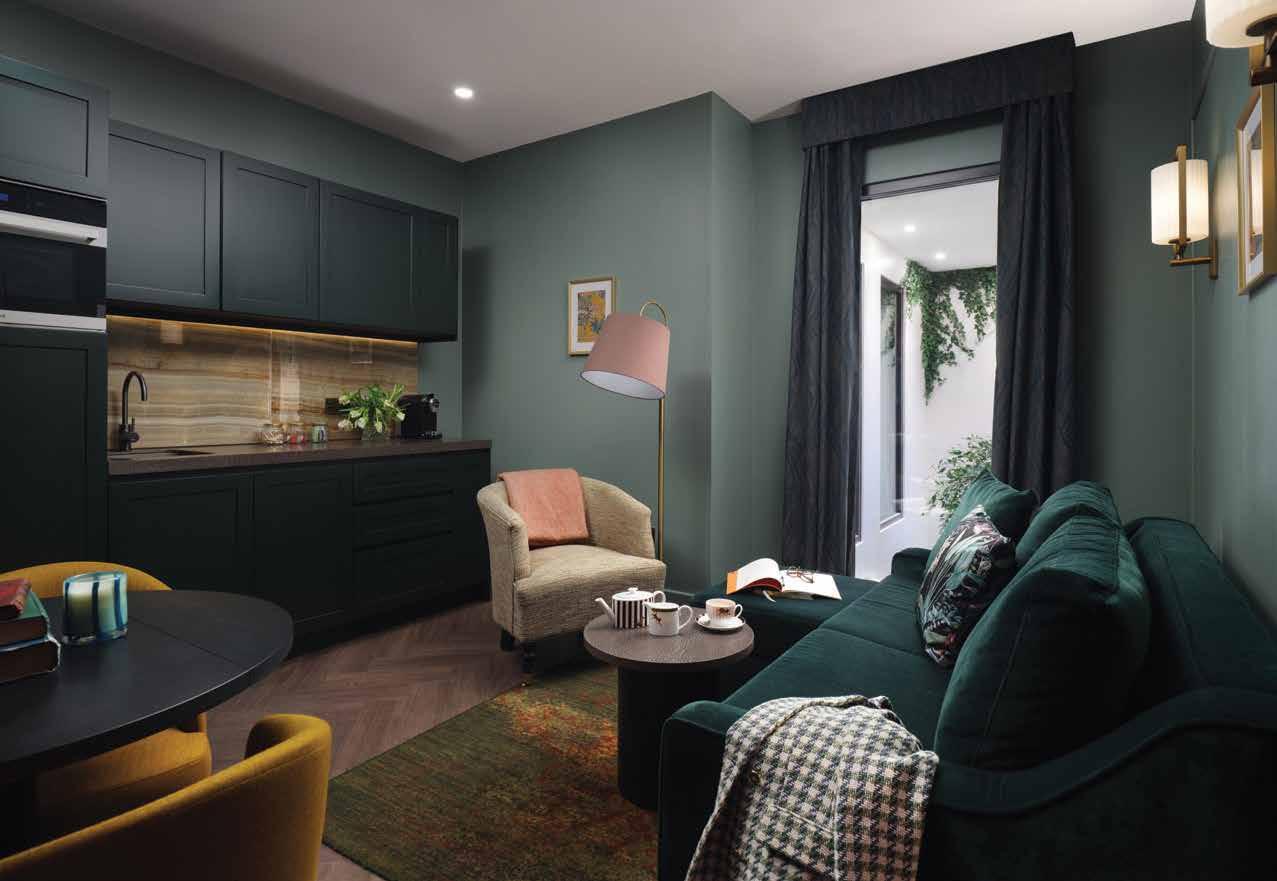 10 people. Guests have the option to interconnect two, three or four Club Flats all behind a single front door or around a private internal courtyard, which acts as the ultimate majlis. Featuring discrete private flats that open onto communal living spaces, these exceptional residences allow guests to reconnect – and disconnect – as they wish, making them ideal for multi-generational family stays. For special occasions, the Courtyard Combos comprise five private flats, sleeping 10 guests in total. These feature-packed abodes are centred around a leafy two-storey courtyard with a glass-covered atrium, providing the perfect place to celebrate and collaborate in a stylish alfresco-style setting – no matter the London weather.