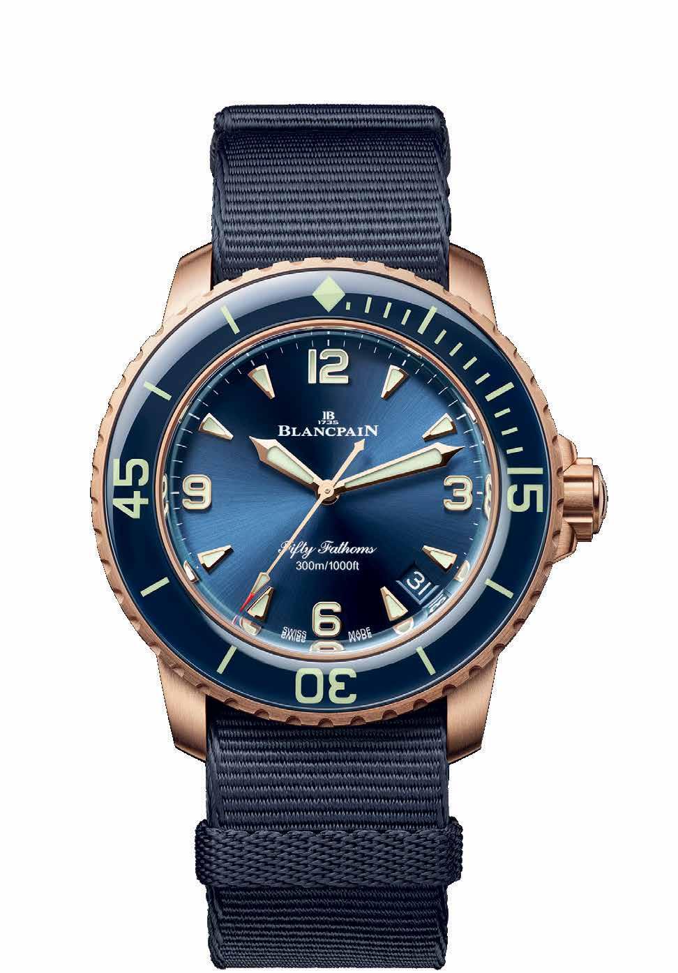 first time in its long history. Now that size is offered again in the guise of Fifty Fathoms Automatique models. These red gold or grade 23 titanium timepieces come with a wide choice of straps (sail-canvas to textured rubber) coloured blue or black.