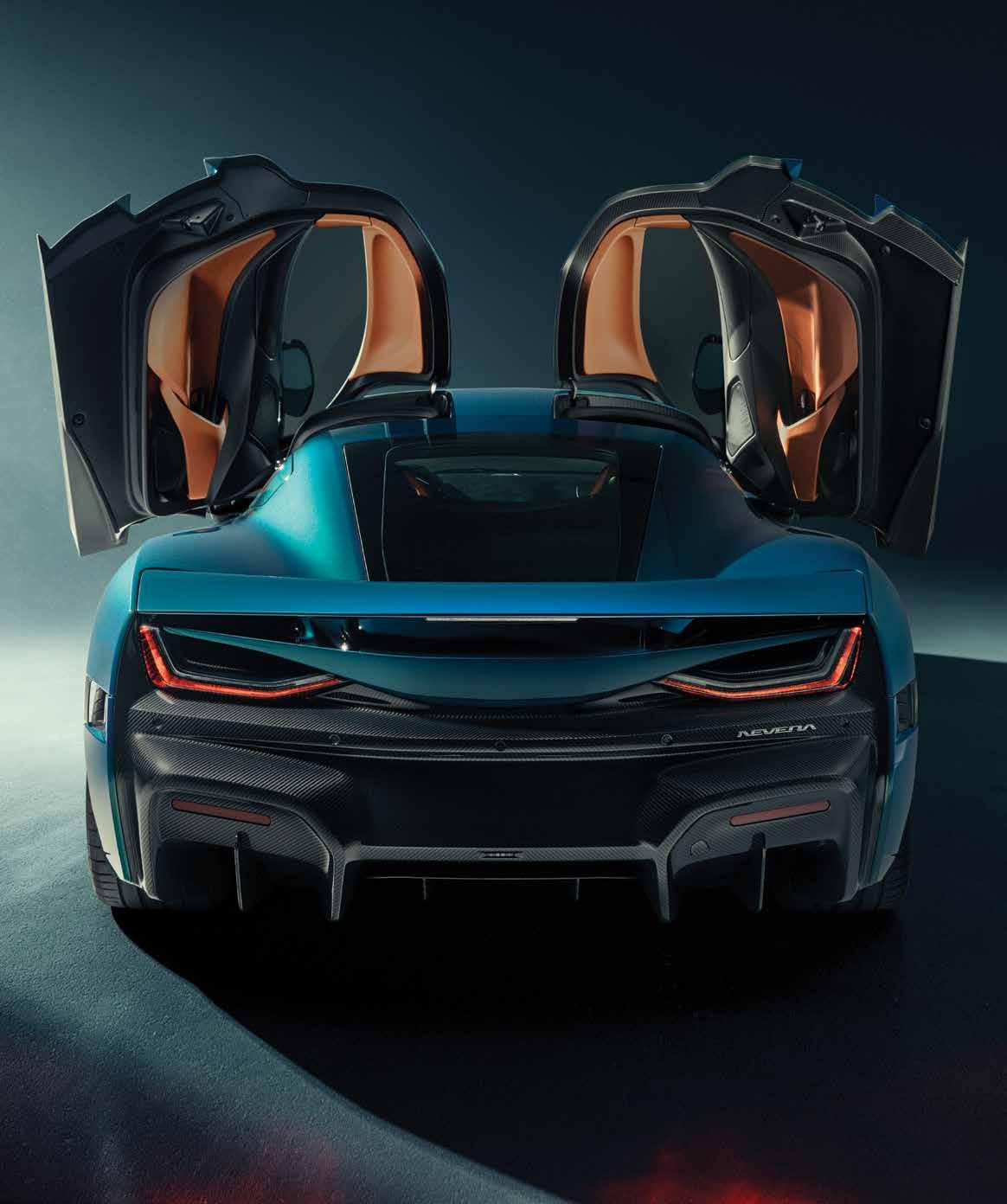 More theatre is brought to the Nevera’s appearance by the use of butterfly-wing doors. They’re surprisingly heavy to operate, though they do incorporate a sizeable section of the roof and side sill, which makes getting in and out a cinch.