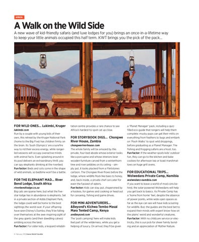 FOR WILD ONES… Lukimbi, Kruger lukimbi.com Run by a couple with young kids of their own, this retreat by the Kruger National Park (home to the Big Five) has children firmly on the brain. Its ‘bush Olympics’ are a surefire way to rid their excess energy, while rangerled sessions will occupy overactive minds with animal facts. Even splashing around in its pool delivers an extraordinary thrill; you can spy elephants drinking at the riverbed. Fun factor: Beds and cots come in the shape of wild animals, so bedtime won’t be a battle.