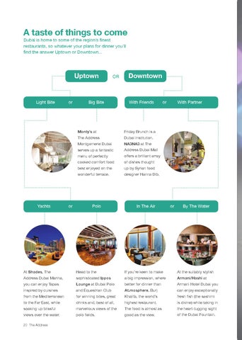 A taste of things to come Dubai is home to some of the region’s finest restaurants, so whatever your plans for dinner you’ll find the answer Uptown or Downtown...