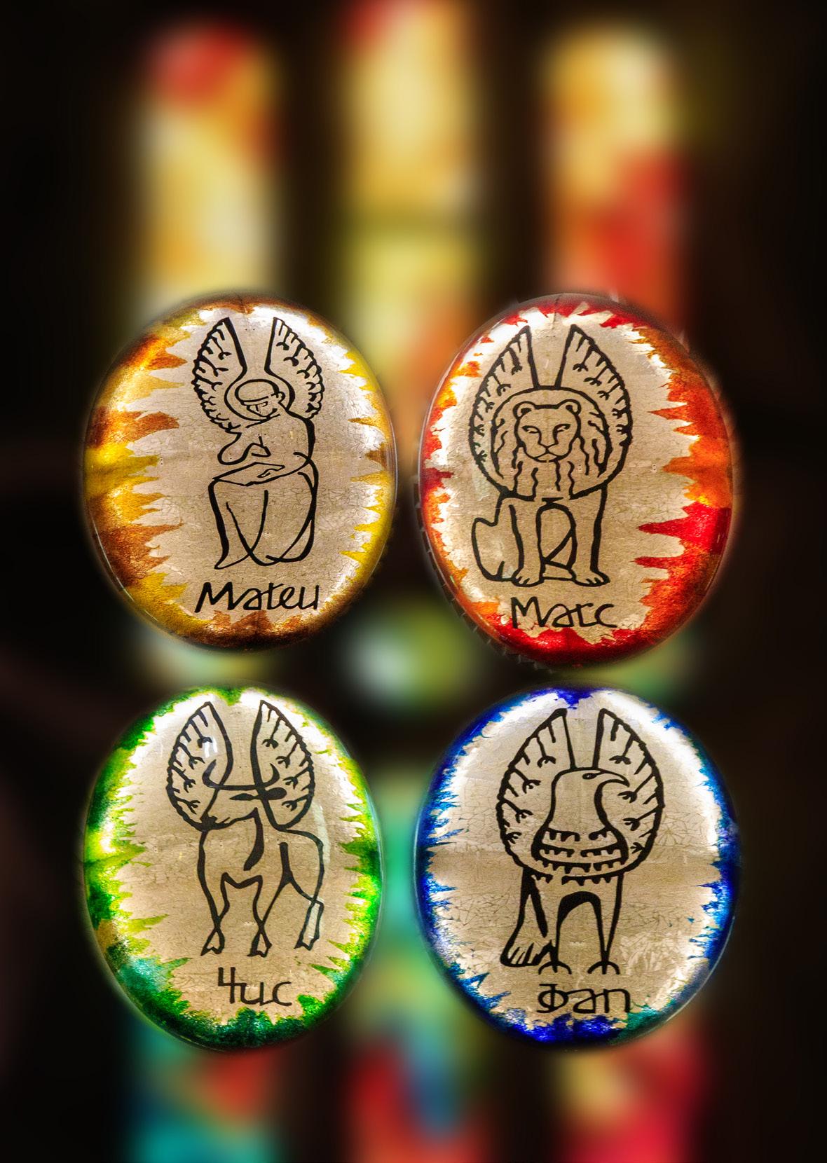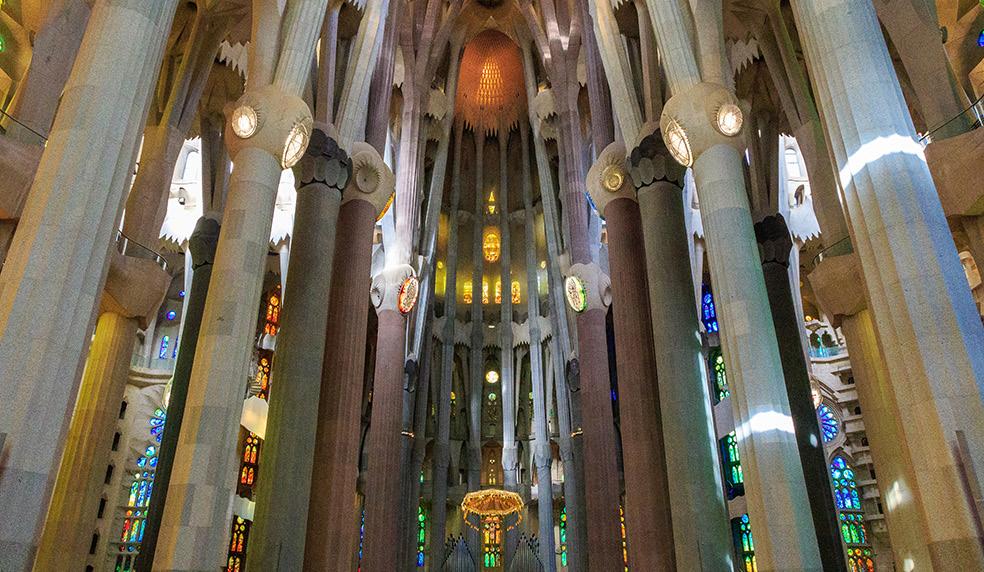 and yellowish sedimentary sandstone. The columns’ bases reflect this order of importance too: the central ones are a 12-pointed star, whereas the others have 10-, eight- and six-pointed stars, in decreasing level of importance. Gaudí thought of everything! When the natural light begins to fade, the lamps on the columns illuminate the inside of the church with a very colourful light. But what of the symbolic representation of the four Evangelists (Gospel writers) on the central columns?