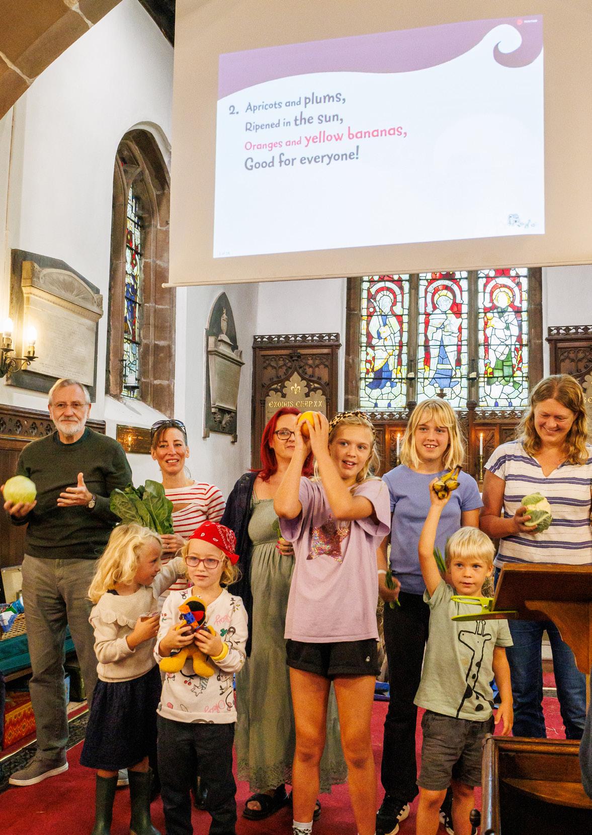 As the main crop gathered in Pott Shrigley and the surrounding hills is hay, Lynn decided we should have a competition: The Great British Bale Off. It bore a certain resemblance to the Antiques Roadshow’s basic, better, best game too. And that is what’s happening on the front cover… we were told to feel, smell, and look carefully at each bale before deciding which was the best specimen, though those of us hay fever sufferers sensibly didn’t stick our noses in the hay – at least that’s my excuse for plumping for the second-best bale. Skilfully umpired by David Garton, there was no peasants’ revolt –instead we thanked God for His bounty, whilst remembering those farmers both here and around the world who have not been able to gather good crops this year. And so to the inside back cover… and a reprise of the Harvest Samba so ably performed (or so Sheila, Mildred, Rebecca, Jimmy, and Stevie thought) by the Pott puppets at our 2021 harvest celebrations. This time we had real live vegetables and their humans doing the honours, and they did pretty well too. And another person who did extremely well was Tyler, who read us a