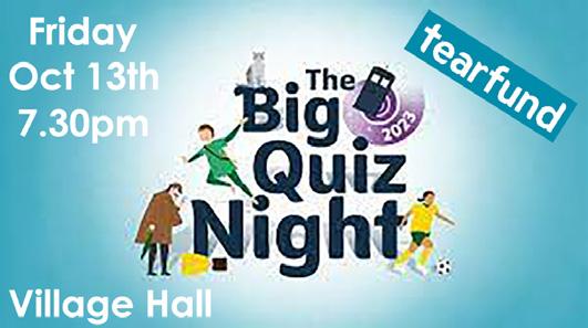 Enthusiastic TBQs (Tearfund Big Quizzers) will already have Friday 13th October in their diaries as the date for this year’s night of fun whilst incidentally raising money for Tearfund. The excitement will begin at 7.30pm in the village hall, an excellent addition to the usual entertainment of the village hall bar open evening. Who knows? Perhaps we can persuade some to drag themselves away from the bar to come and join us…