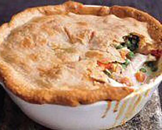 Cover the dish with the lid, sealing the edges. Make a hole in the centre and decorate with leaves cut from the pastry trimming. Brush with beaten egg and bake in oven for 30 minutes until golden.