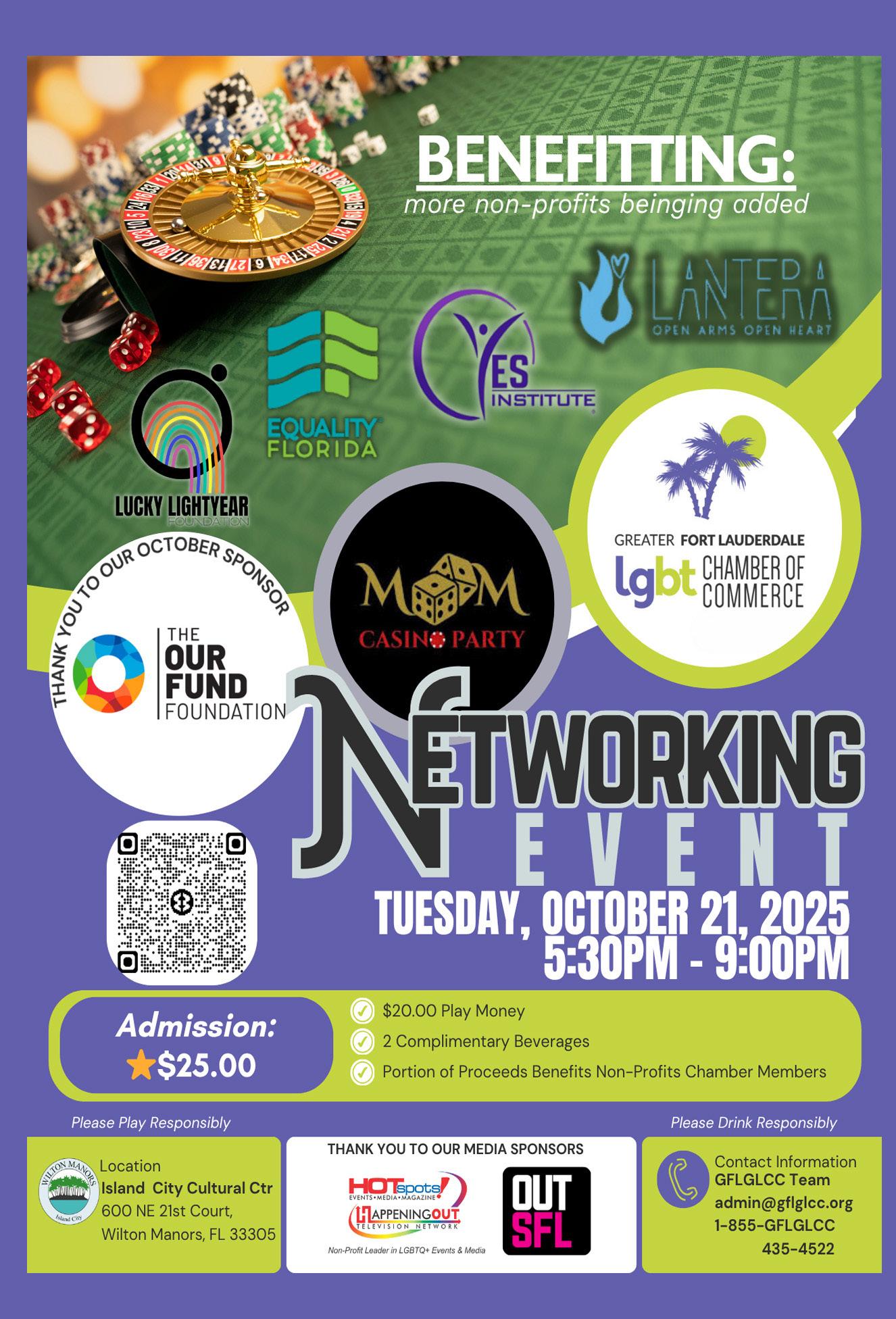 The GFLGLCC presents their October Networking event, which this month will be sponsored by The Our Fund Foundation and double as M&M Casino Party benefitting (at press time, but more to add) Lucky Lightyear, Equality Florida, Yes Institute, and Lantera. The event is from 5:30pm to 9pm at Island City Cultural Center (600 NE 21st Court), and admission is $25 which includes $20 play money, and 2 complimentary beverages. To purchase tickets, go to GFLGLCC.org.