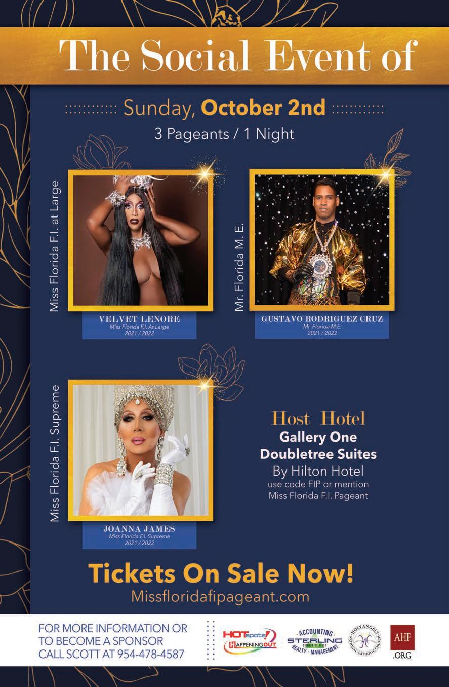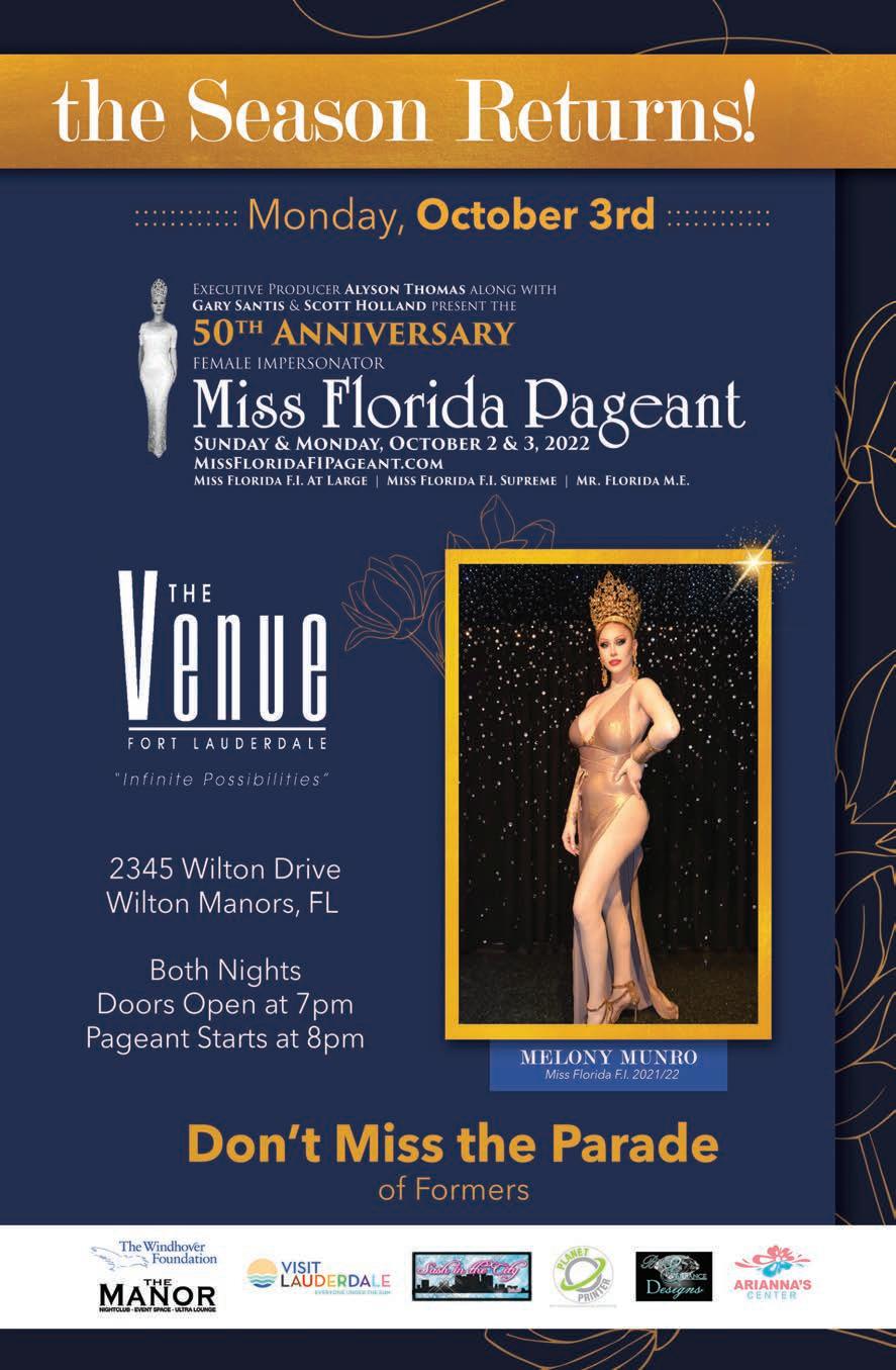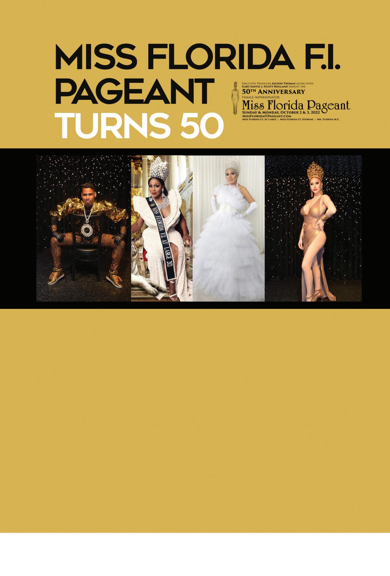 The Miss Florida F.I. pageantry system will take place on Sunday and Monday, October 2 and 3 at “The Venue” in Fort Lauderdale with doors opening each night at 7pm and pageant starting at 8pm sharp. To purchase tickets go to MissFloridaFIPageant.com.