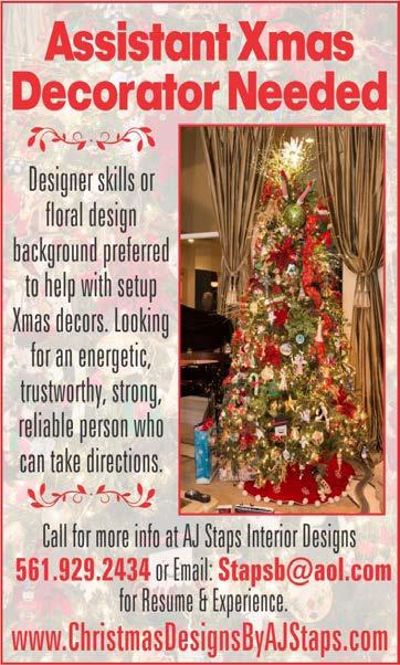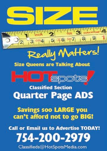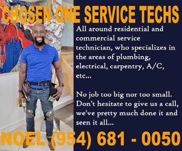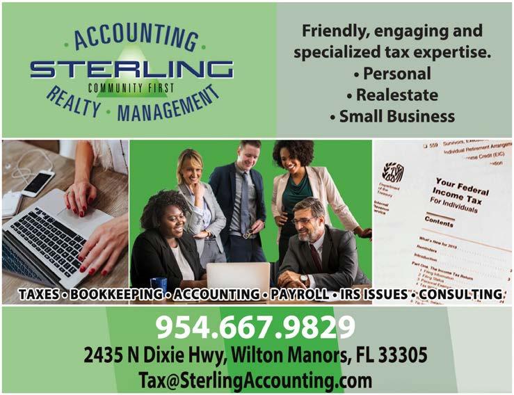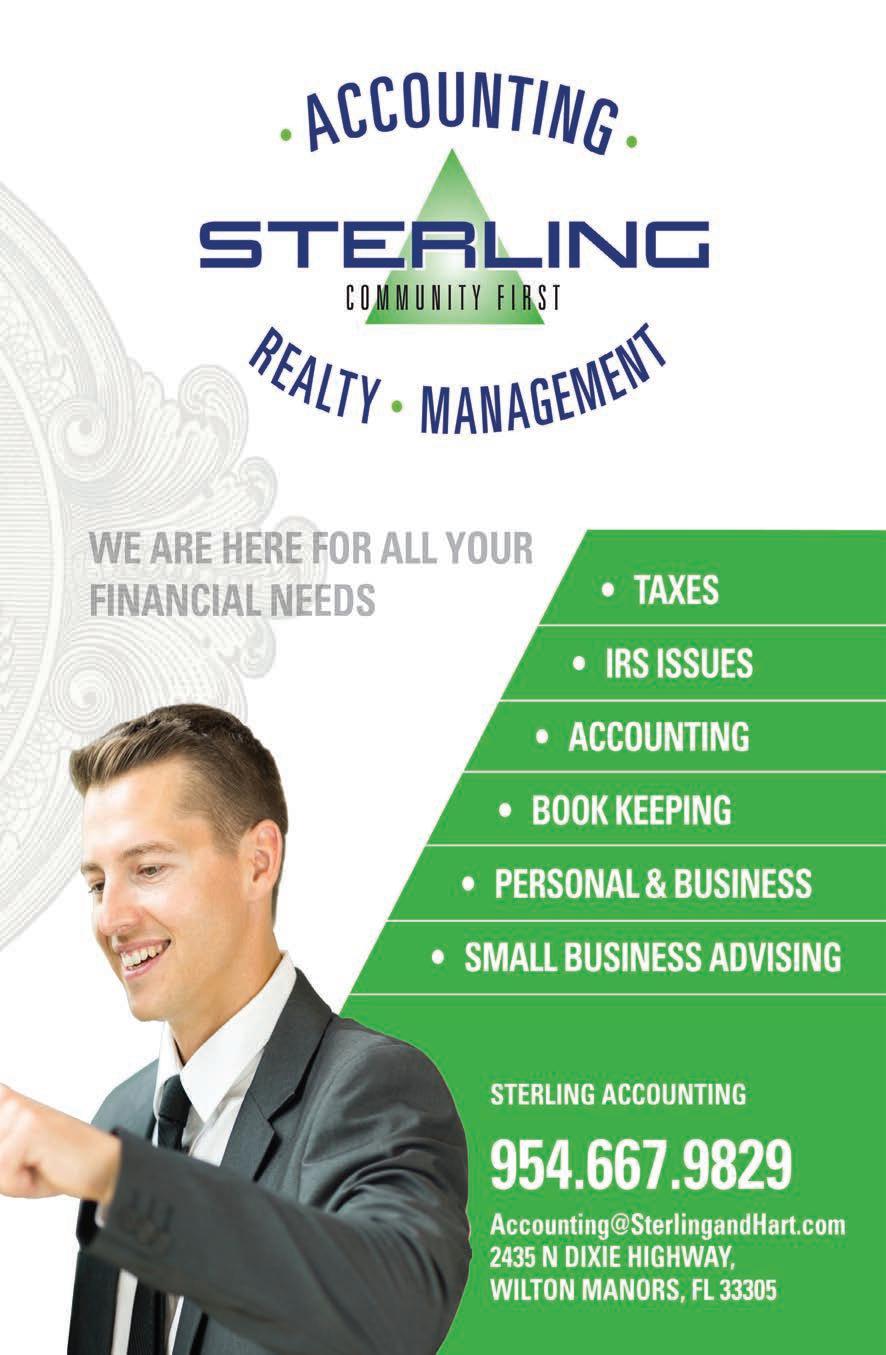TV Wall mounting, Ceiling Fans, Bathroom, kitchen, faucet, microwave, plumbing and electric, outlets, switches, breakers. Time clocks, Upgrade breaker box, repair or replace sprinkler & pool motors, replace & remove hot water tanks & install tankless water heaters. Bathroom, Vanity, sinks, dishwasher & garbage disposals and SHOWER GRAB BARS. Replace Door knobs and locks (locksmith). K&J 954-260-9940 BEST PRICES IN TOWN! 32 Years Experience. ‘RTS ELECTRIC’ 24-HOUR SERVICE Quality work at a reasonable price. We also service & install any size generator. Licensed & Insured (98-CME-1807-X). 954-257-9509. ELECTRICAL u ADVERTISE IN MARKETPLACE Call 754-200-2979 Email Classifieds@HotSpotsMedia.com ACCOUNTING u STERLING ACCOUNTING Friendly, engaging and specialized expertise for individuals and those with small businesses and real estate. Call Sterling Accounting at 954-667-9829. Tax@SterlingAccounting.com 124 | HotspotsMagazine.com