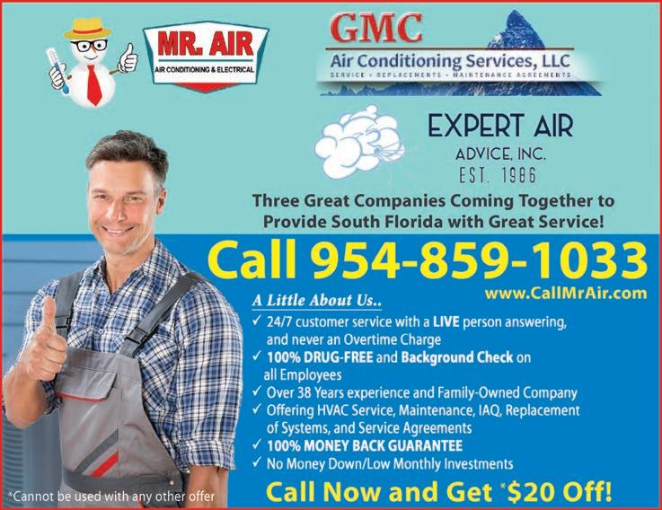 MAINTENANCE / IRRIGATION u COMPUTERS u HELPMEERIC.COM ! TECH SUPPORT Your Personal Tech Assistant. BEST RATES in the tri-county area. Specializing in Android & iPhones. PC/Mac-Training, Installation, Clean-up & Repairs. Friendly, In-Home and remote Srvc. Call/Txt 954-903-4383. **OPTIMA** COMPUTER REPAIR 954-817-3883 IN-HOME SERVICE. Cell phones, printers & Internet issues. Proudly serving our community for over 20 years. *Get the BEST performance, protection & value from your computer investment. *A+ Hardware & OS certified. *Friendly, professional, RELIABLE service. Reasonable rates. Call: Mike 954-817-3883 CENTRAL AIR CONDITIONING Repairs, installations, indoor air quality. Residential/ Commercial. Proudly serving the tri-county area. Quality and experience. Free service calls for all A/C makes and models. Lic/Ins CMC1249558 Call 954-274-8287 for your free estimate. **10% off your first repair** AIR CONDITIONING u YOGA u IRRIGATION SYSTEM REPAIR AND MAINTENANCE 30 Years experience, excellent work, referrals upon request. Call Roberto at 954-383-8980 CLEANING SERVICES u
