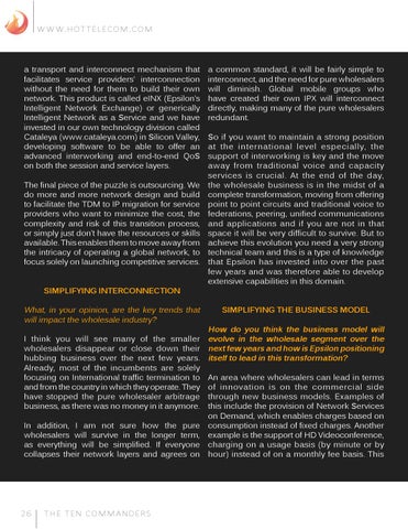 So if you want to maintain a strong position at the international level especially, the support of interworking is key and the move away from traditional voice and capacity services is crucial. At the end of the day, The final piece of the puzzle is outsourcing. We the wholesale business is in the midst of a do more and more network design and build complete transformation, moving from offering to facilitate the TDM to IP migration for service point to point circuits and traditional voice to providers who want to minimize the cost, the federations, peering, unified communications complexity and risk of this transition process, and applications and if you are not in that or simply just don’t have the resources or skills space it will be very difficult to survive. But to available. This enables them to move away from achieve this evolution you need a very strong the intricacy of operating a global network, to technical team and this is a type of knowledge focus solely on launching competitive services. that Epsilon has invested into over the past few years and was therefore able to develop extensive capabilities in this domain. SIMPLIFYING INTERCONNECTION