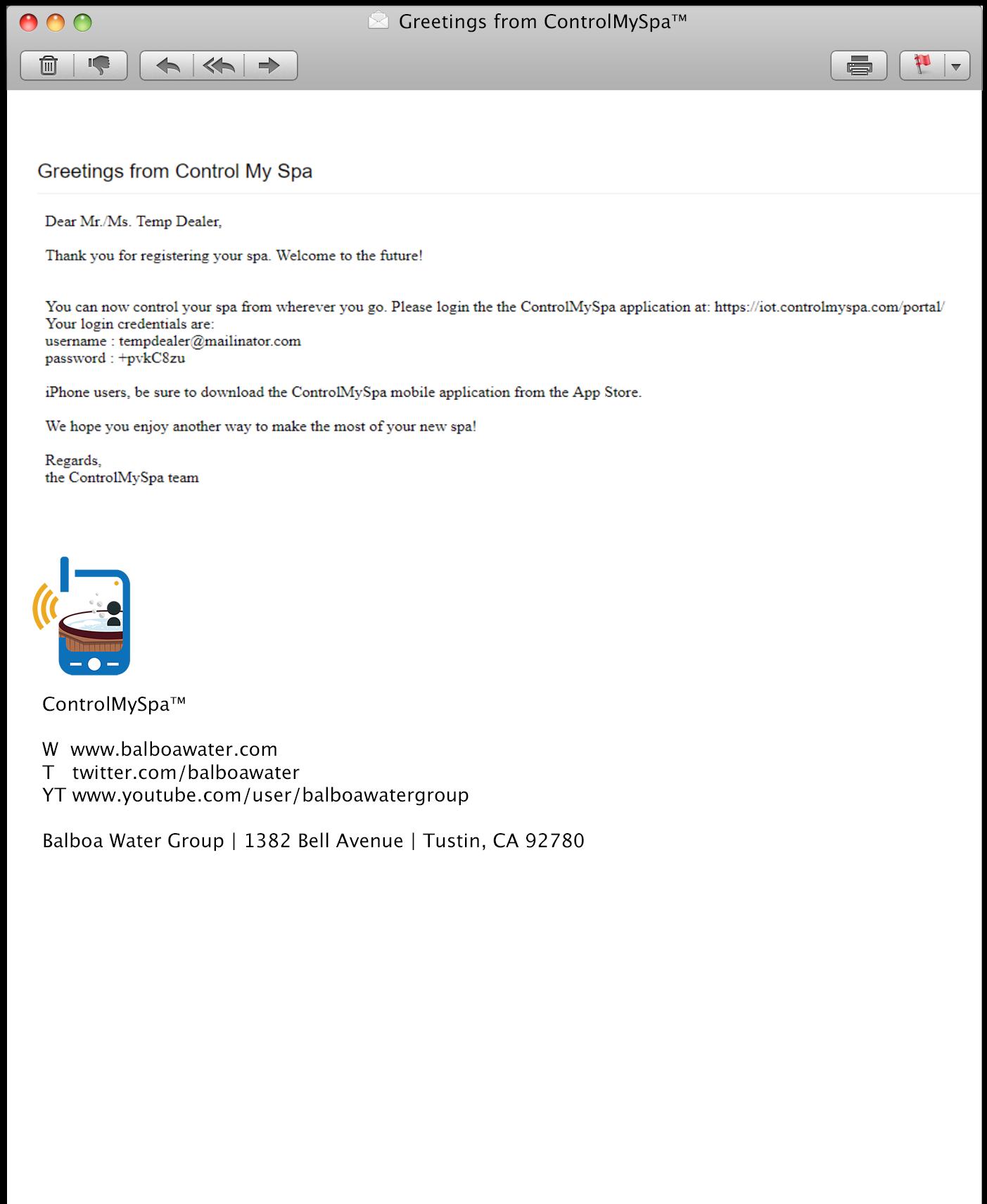 • Initial OEM ControlMySpa™ log-in and password is obtained from Balboa Water Group.
