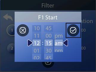 3 - Select the start time for Filter Cycle 1 (C). Press the SELECT navigation button to view the time controls (E).