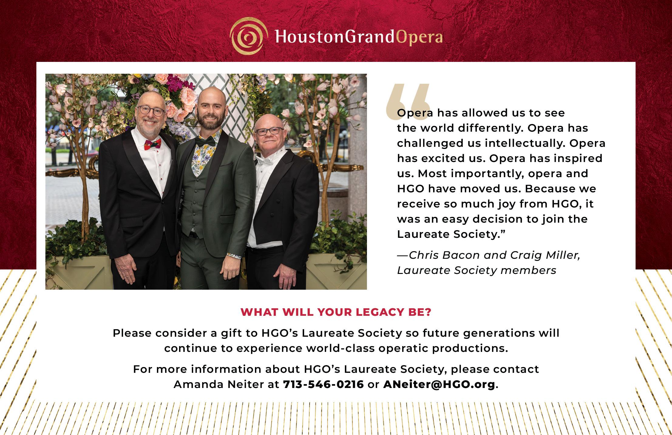 For information on all Houston Grand Opera productions and events, or for a complimentary season brochure, please email the Customer Care Center at CustomerCare@HGO.org or telephone 713-228-6737.