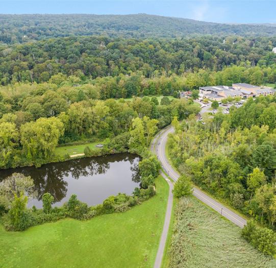 Modern suburban town with rural roots, featuring winding roads and wooded escapes.