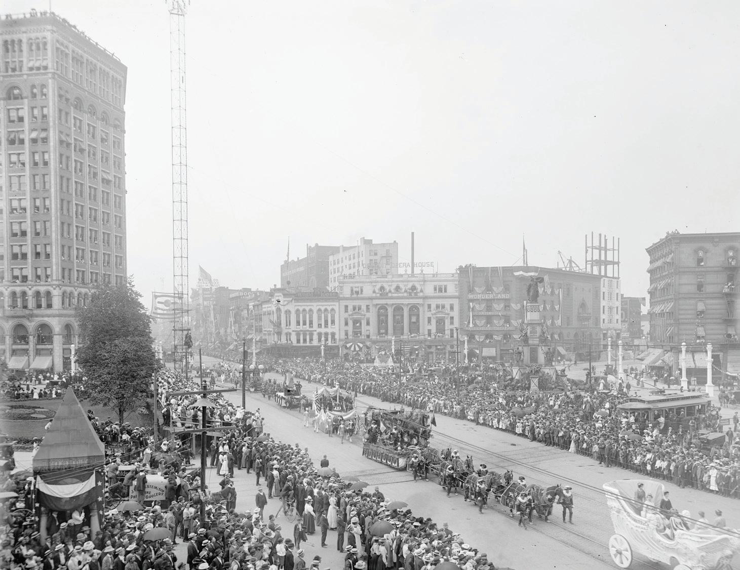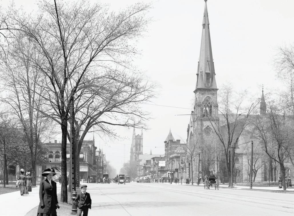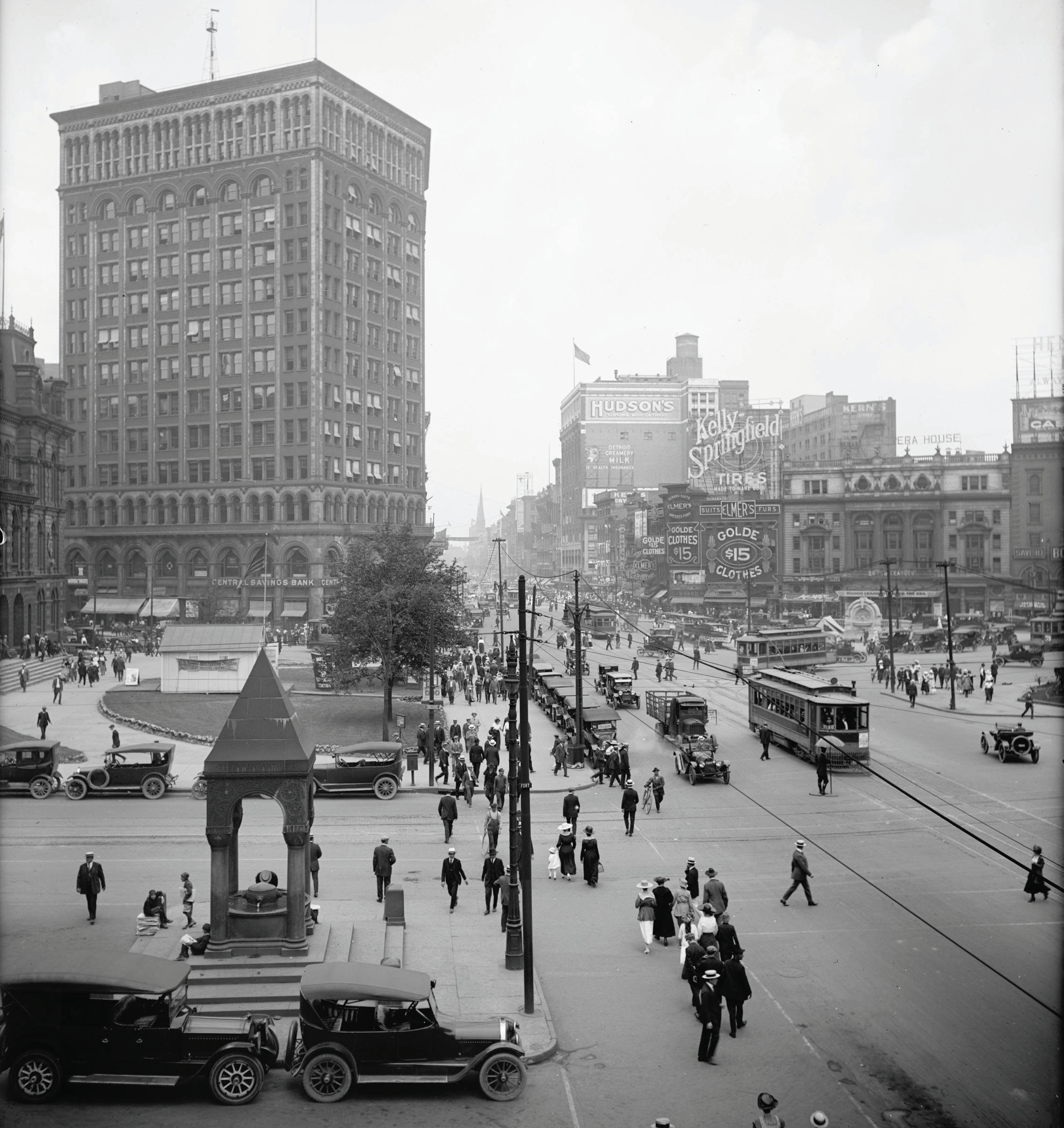 This photo, taken in downtown Detroit sometime between 1900 and 1910, shows Gratiot Avenue Avenue from Woodward. To learn more about the history of America’s first concrete-paved road, flip to page 43.