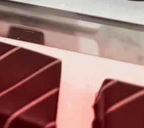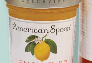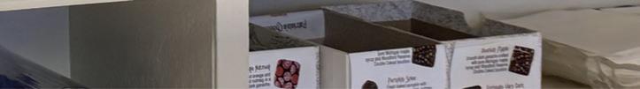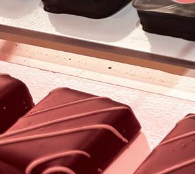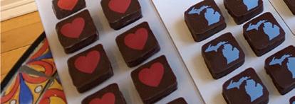 e display case is lled with tray a er tray of di erent squares of ganache and caramel, each more intriguing than the last. Flavors include cherry, blueberry, co ee, bleu cheese, coconut, honey, lemon, …. Many are decorated with hearts or lighthouses or the outline of Michigan, with both peninsulas. Some have curvy lines that look like ne art.