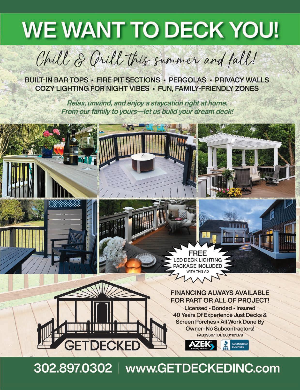 40-plus years of experience in just decks! All work done by owner; no subcontractors/salespeople. Familyowned and operated. Awardwinning/all-inclusive/worry-free custom decks. 50-year material warranty and lifetime workmanship warranty. Fully licensed/bonded/insured. Proud 15-plus year member with A+ rating with BBB! Think Get Decked! Call for your free in-home estimate today! 302-897-0302
