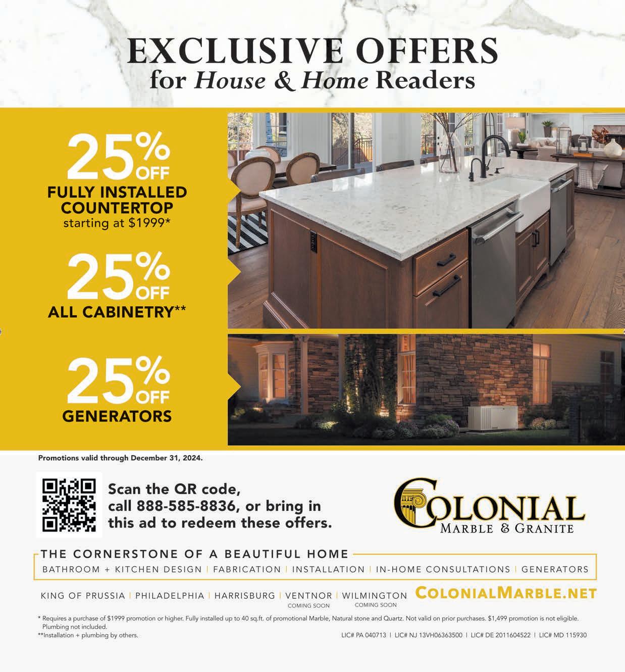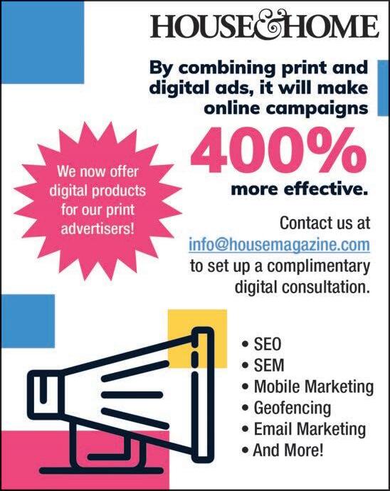 Before attempting any renovation or repair project mentioned in H&H, readers are advised to consult with professional home repair and renovation specialists for assistance, and to take any and all appropriate safety precautions. HOUSE & HOME has not independently tested any products or services advertised herein and has verified no claims made by its advertisers regarding those services or products. HOUSE & HOME. makes no warranties or representations and assumes no liability for any claims regarding those services or products or claims made by advertisers regarding such products or services. Readers are advised to consult with the advertiser and/or other home repair and renovation professionals regarding any such claims and regarding the suitability of an advertiser’s products. No reproduction of printed materials is permitted without the consent of the publisher of HOUSE & HOME. Copyright 2012 by HOUSE & HOME. Magazine, LLC, all rights reserved. Subscription available for home delivery at our website, www.HouseMagazine.com, at a cost of $19.95 per year.