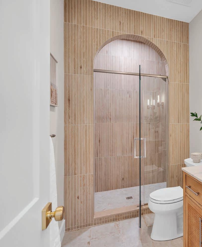 When these homeowners turned to Amiano & Son to remodel their entire home it was the perfect job for the company’s lead designer Sophia Amiano. While still keeping the home’s original bones intact, Amiano was able to reimagine each space by including several key features. Some of these updates included larger windows for better ocean views and shiplap on the ceiling blended with raw wood beams to add luxury while maintaining a coastal vibe. To further add unique character to the home, she also added focal points throughout like a wood tiled arch in the bathroom.