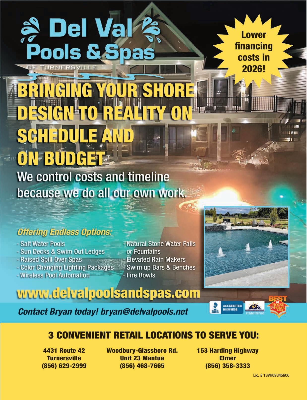 OWADAYS, BUILDING A POOL AT THE SHORE IS MORE THAN AN INVESTMENT IN YOUR PROPERTY VALUE: IT’S AN EXTENSION OF YOUR HOME. We spoke with Bryan Hull, co-owner of Del Val Pools & Spas, to learn more about the unique approach that needs to be taken when adding a pool to your Shore home’s outdoor living space and how the company can help make your dreams a reality.