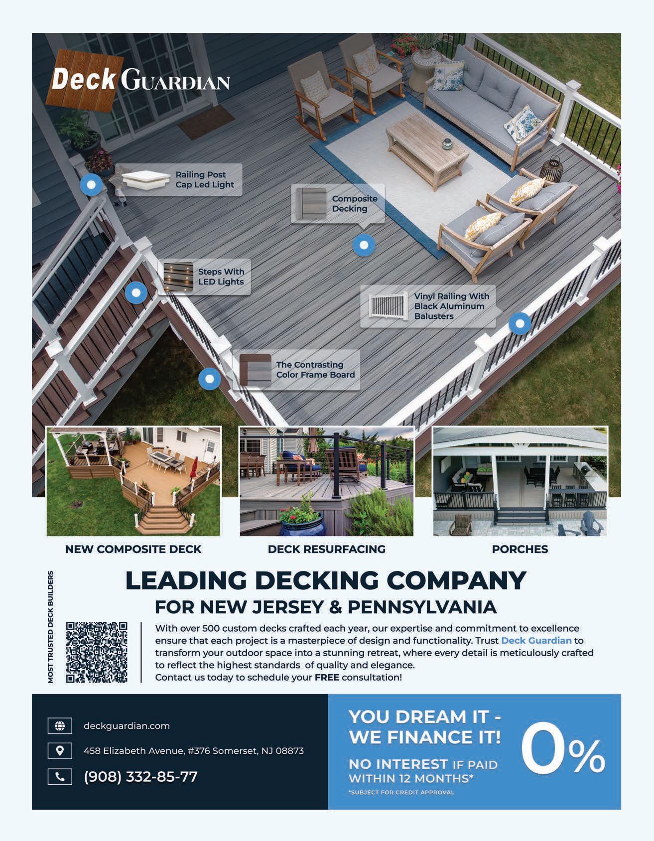 place. Incorporating natural elements like planters, vertical gardens or even water features brings a sense of calm and connection to the outdoors,” says Joe Oakes, owner of First State Building & Design. “And don’t forget the power of flexibility—modular furniture, retractable shade systems and smart lighting let the deck evolve with your needs. Ultimately, a great deck feels like more than an outdoor platform—it feels like a destination.”