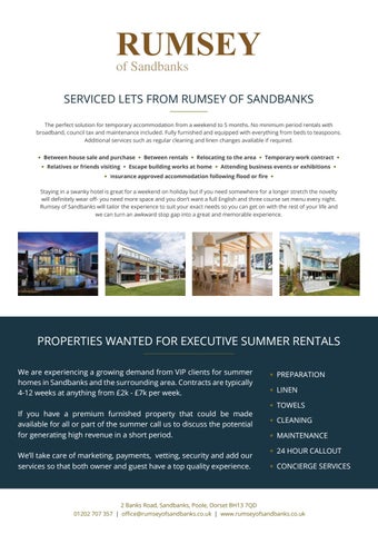 PROPERTIES WANTED FOR EXECUTIVE SUMMER RENTALS We are experiencing a growing demand from VIP clients for summer homes in Sandbanks and the surrounding area. Contracts are typically 4-12 weeks at anything from £2k - £7k per week. If you have a premium furnished property that could be made available for all or part of the summer call us to discuss the potential for generating high revenue in a short period. We’ll take care of marketing, payments, vetting, security and add our services so that both owner and guest have a top quality experience.
