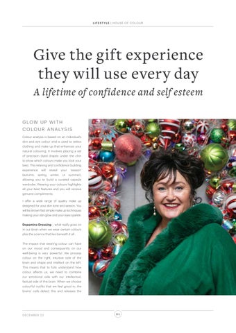 Give the gift experience they will use every day A lifetime of confidence and self esteem G LO W U P W I T H C O LO U R A N A LY S I S Colour analysis is based on an individual’s skin and eye colour and is used to select clothing and make up that enhances your natural colouring. It involves placing a set of precision dyed drapes under the chin to show which colours make you look your best. This relaxing and confidence building experience (autumn,
