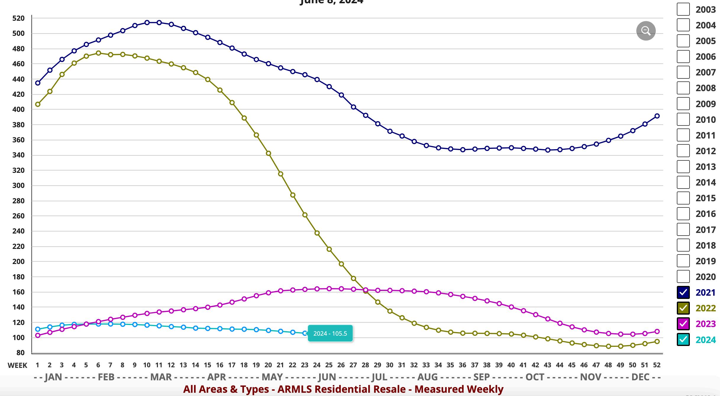 We are entering the weakest time of the year, between June and September when luxury home buyers are thin on the ground. They tend to find cooler places to hang out than face the heat of a Phoenix summer house hunting expedition. Investors are busy during the summer as bargains are easier to find and gross margins on fix-and-flips are looking very healthy these days. Investors tend to pay less than market value, so this also drives the average $/SF lower between June and September We expect pricing to be flat to lower over the next 3 months, after a strong rise between January and May.