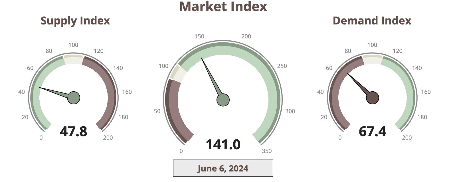 The 100 mark represents the index value for a balanced market A value above 100 represents a market that favors a seller A value below 100 represents a market that favors a buyer. The Market Index Trend is down 12 1 pts in the last month