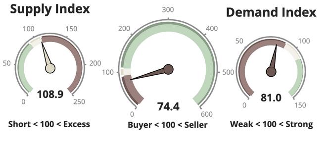 The 100 mark represents the index value for a balanced market. A value above 100 represents a market that favors a seller. A value below 100 represents a market that favors a buyer