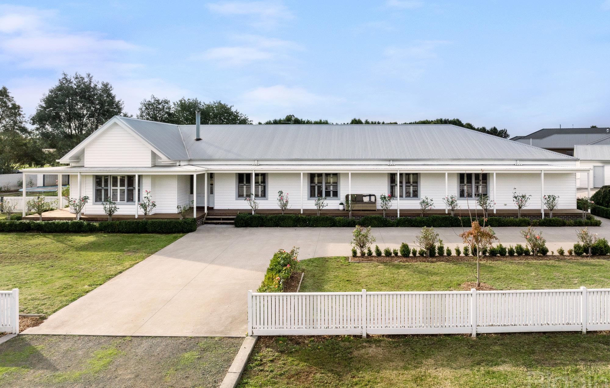 Experience the epitome of luxury country living with this stunning property nestled on approximately 1 acre of picturesque landscape. Enclosed within charming white picket fencing, the lush green lawns, established gardens, and meticulously manicured roses create an idyllic setting that embodies tranquillity and elegance.