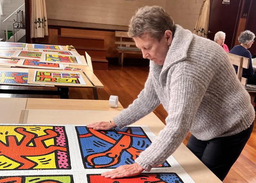 Measuring 5.5 x 2 metres and weighing 19.05kg, the puzzle was too large for Bullarto residents Eddy and June Pleban to set up under their roof so they brought it to the hall to assemble across trestle tables. “Eddy bought the puzzle for me 10 years ago as a joke. It came with a hand truck,” June, pictured, said. “I started and finished one panel, which was 4000 pieces but then put it aside. The whole thing has 32,256 precisioncut pieces and consists of just six colours plus black and white which adds to the already incredible challenge.” It wasn’t until the pandemic lockdowns that June pulled out the puzzle and had another go. Seven panels and one year later, the retrospective work featuring 32 individual, brightly-coloured images by famed (deceased) American artist Keith Haring was finished.