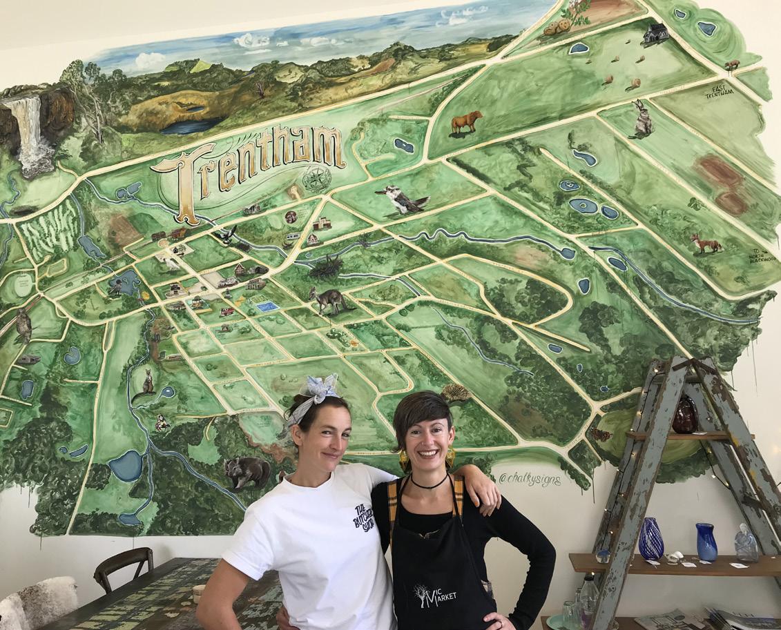 The map is the work of local artist Natalie Davis from Chalkysigns and can be found at the Vic Market Community Cafe in Trentham. The map features Trentham’s iconic spaces and fauna. Vic Market is a new space opposite the historic Trentham Railway Station offering locally made consumables and crafted goods.