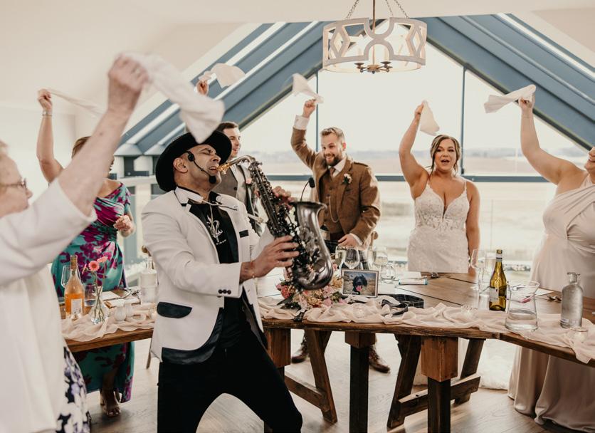 For our civil ceremony, I wore my greatgrandmother’s wedding dress — a stunning piece of family history. Trying it on with my Grandma before her dementia worsened was incredibly special, and it felt like having her with me on the day. For the Indian ceremony, I wore a stunning Shyamal & Bhumika saree that I’d been dreaming of for years. I had the blouse custom-designed and I loved how the intricate details came together. In the evening, I swapped into a beautiful Monsoon dress for our ceilidh, accessorised with my family’s tartan sash and vintage Cornelia James gloves I found (last minute!) on eBay.