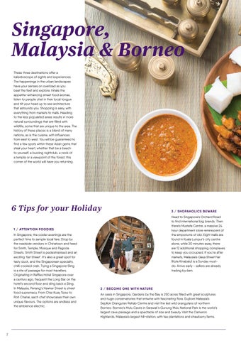 1 / ATTENTION FOODIES In Singapore, the cooler evenings are the perfect time to sample local fare. Drop by the roadside vendors in Chinatown and head for Smith, Temple, Mosque and Pagoda Streets. Smith Street is pedestrianised and an exciting ‘Eat Street’. It’s also a great spot for tasty duck, and the Singaporean specialty, chilli cooked crab. Trying a Singapore Sling is a rite of passage for most travellers. Originating in Raffles Hotel Singapore over a century ago, frequent the Long Bar on the hotel’s second floor and sling back a Sling. In Malaysia, Penang’s Hawker Street is street food supremacy. From Char Kuay Teow to Roti Chanai, each chef showcases their own unique flavours. The options are endless and the ambience electric.