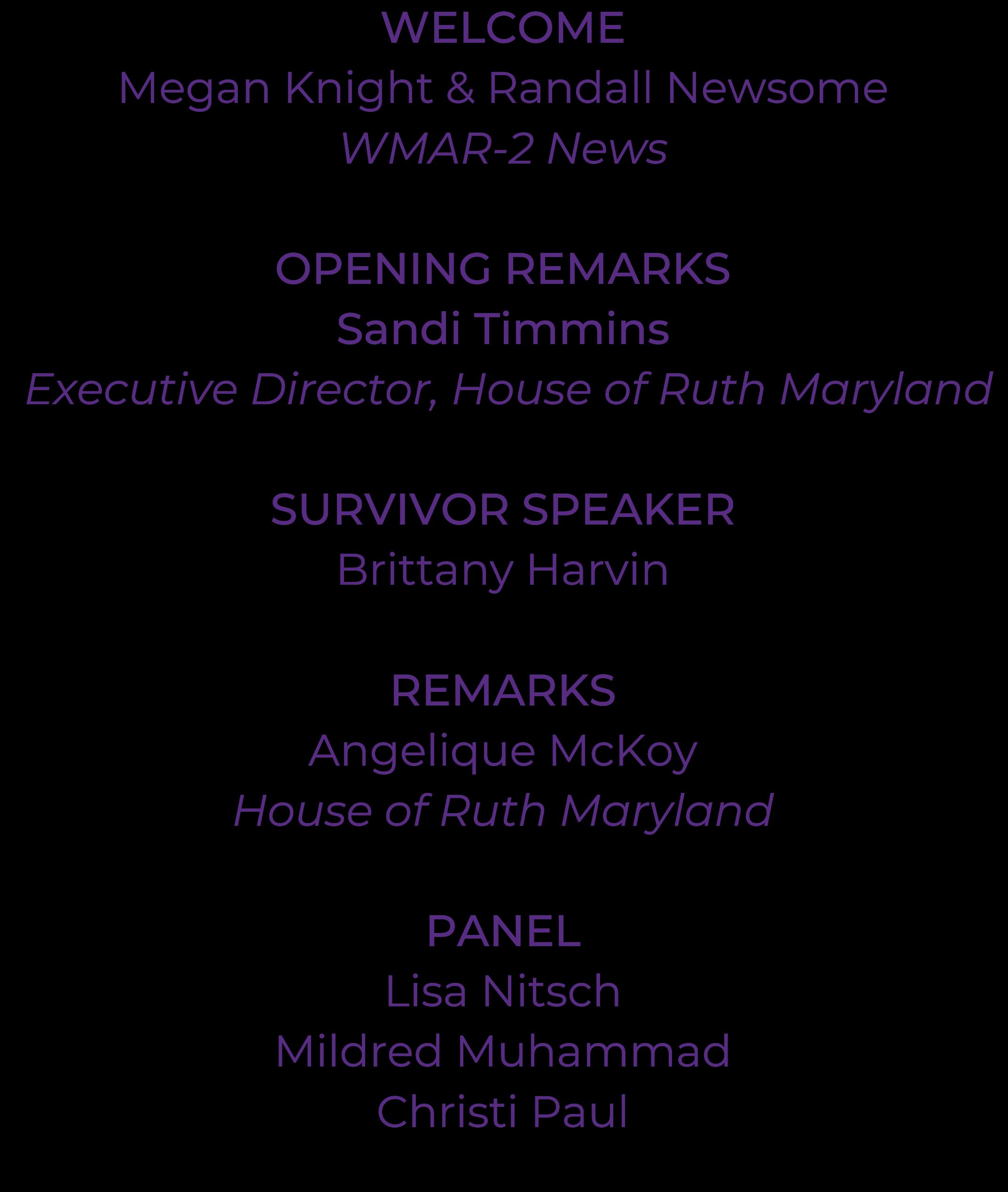 We hope you find today’s program informative and ask that you continue your unwavering support as we not only provide life-saving services to survivors of intimate partner violence and sexual assault, but also confront the attitudes, systems, and behaviors, that allow abuse to continue in our communities. A cycle of violence perpetuates through our community and it will take all of us to break this cycle and create a Maryland where every person is safe in their own home.