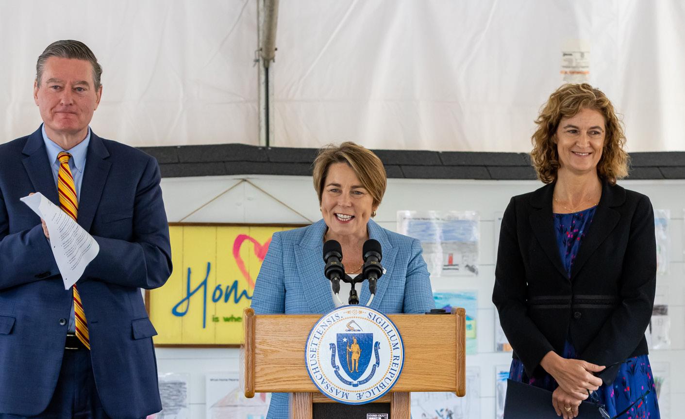 Gov. Maura Healey as she announced historic funding for housing. Pictured with Alisa Magnotta and Ed Augustus, Secretary of the Executive Office of Housing and Livable Communities.